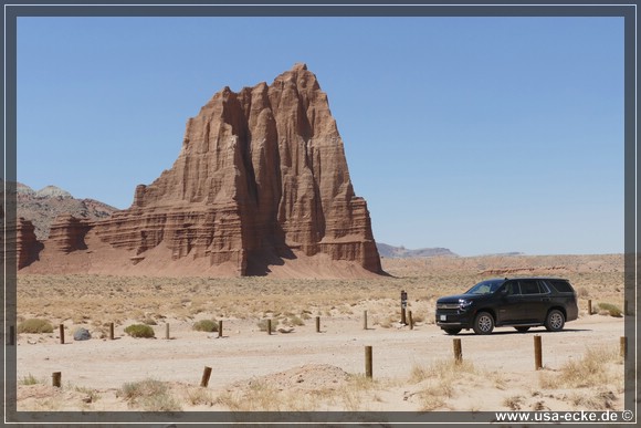 Diese Back Road bis zum Temple of the moon ist zwar nur etwas mehr als eine Meile lang, hinzu kommen jedoch noch einmal 15,5 Meilen one way ueber die Cathedral Valley Road. Hin und zurueck ist man also etwa 54 Kilometer auf Back Roads unterwegs. Mehr Sinn macht da unserer Meinung, gleich den gesamten Cathedral Valley Loop mit den beiden kurzen Abstechern zum Gypsum Sinkhole und den Temple of the Sun and Moon zu fahren. Der ist allerdings mehr als 100 Kilometer lang...
