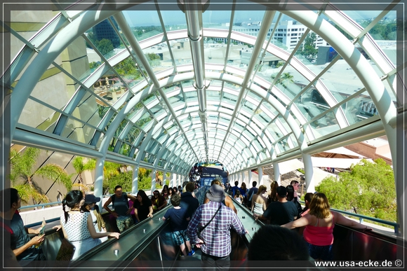Der Park ist auf zwei Ebenen angelegt, die durch lange Rolltreppen verbunden sind. Auf der unteren Ebene sind drei Hauptattraktionen untergebracht, die wir als naechstes fahren: Revenge oft the Mummy, Jurassic Park the Ride und der fuer uns noch ganz neue Transformers the Ride.