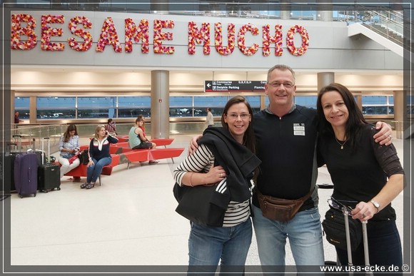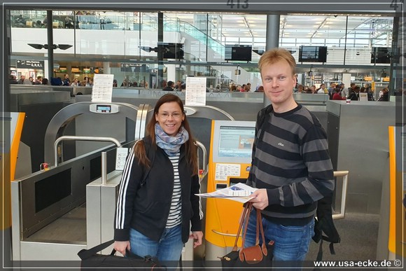 Kurz vor halb neun erreichen wir den Parkplatz von M-Park & Fly, stellen unser Auto ab und lassen uns dann per Bus zum Flughafen bringen. Dort muss ich als einziger an den Ticket-Computer, alle anderen haben ihre Boardkarten bereits gestern online drucken koennen. Nur ich wieder mal nicht. Schuld ist dieses Mal aber nicht mein neuer Reisepass... Dafuer klappt aber wenigstens das Aufgeben unserer Koffer am Automaten problemlos! |