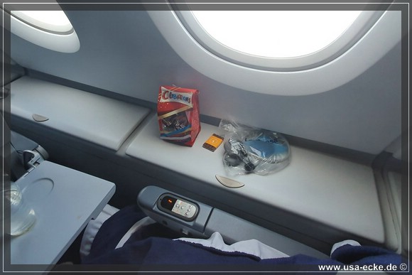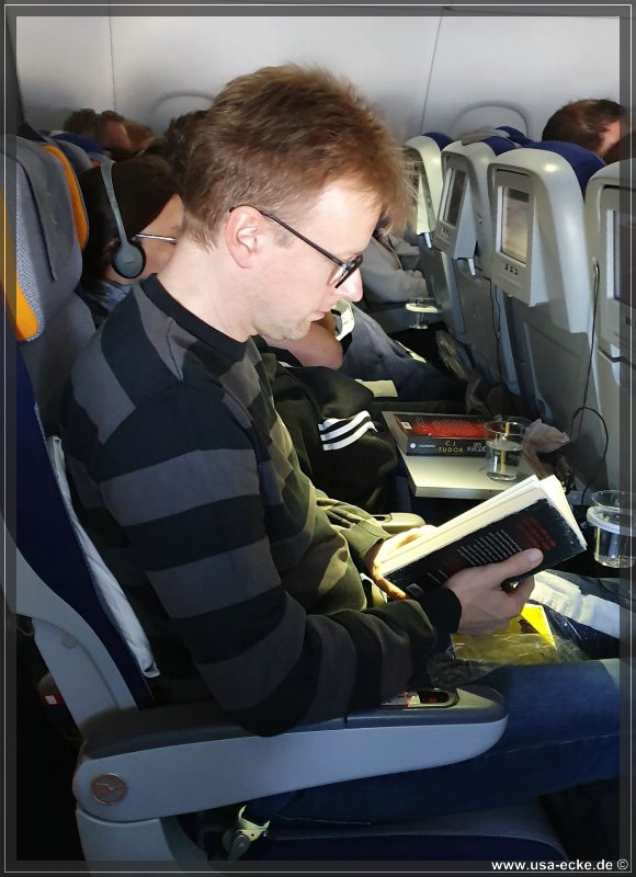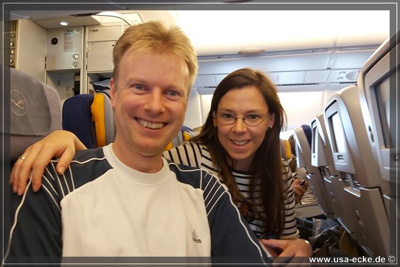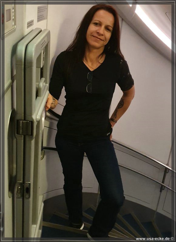 Wir sitzen in der letzten Reihe, eigentlich noch immer unser Lieblingsplatz. Hier in der oberen Etage ist die Bestuhlung 2-4-2, sodass Sylvia und ich keine Nachbarn haben. Auf der anderen Seite des Gangs sitzen Sabrina und Holger, so koennen wir uns auf dem Flug prima unterhalten. |