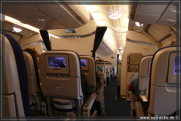 Unsere Sitzplaetze haben wir vorab reserviert, denn zum einen wollten wir vier ja moeglichst zusammen, zum anderen dieses Mal in der oberen Etage sitzen. Letztes Jahr hatten wir bei unserem Flug mit dem A380 nach L.A. Plaetze unten und wir waren einfach neugierig auf oben.