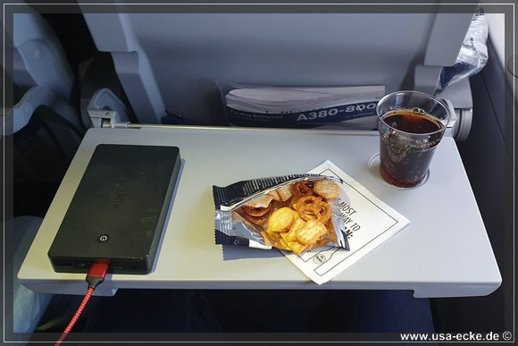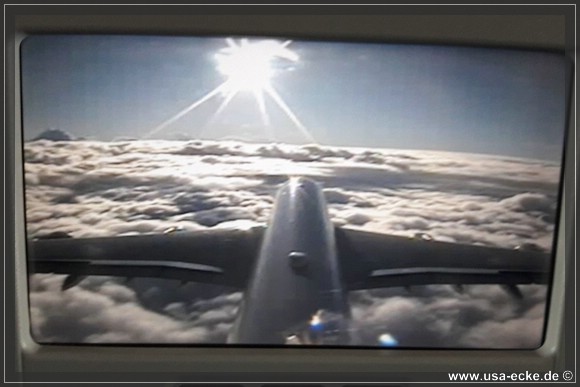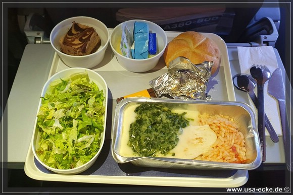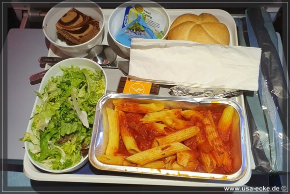 Sylvia moechte wie immer WiFi, um sich die Zeit waehrend des Fluges etwas zu verkuerzen und ich tippe ab und zu mal ein paar Zeilen Reisebericht in den Lappi. Das Essen kommt, doch die obligatorische Frage „Chicken or Pasta“ faellt aus. Zumindest fuer einen von uns. Denn es ist nur noch einmal Chicken da, somit muss der andere zwangsweise die vegetarische Pasta versuchen.