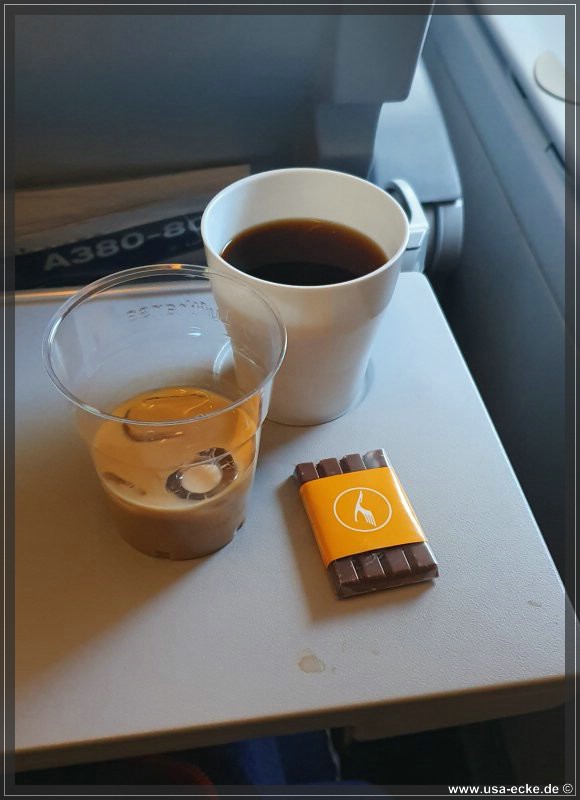 Zum Kaffee gibt es einen Baileys – den nehmen wir doch mit! Dass mir unsere Stewardess jetzt auch noch einige Tropfen Kaffee ueber meine Jeans schuettet, faellt nun auch nicht mehr ins Gewicht. Etwas spaeter verteilt Holger dann noch etwas O-Saft auf seinem Rucksack… na, dann bin ich wenigstens nicht so allein. |