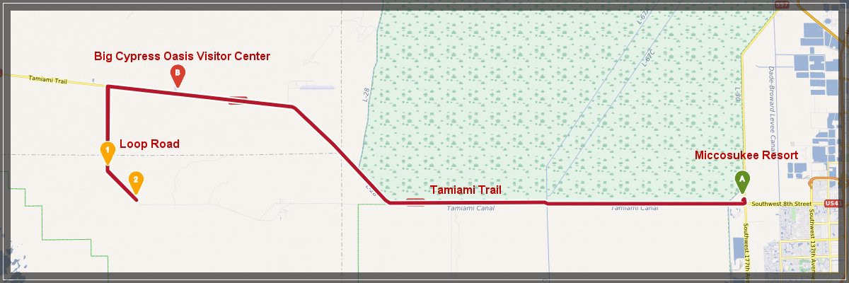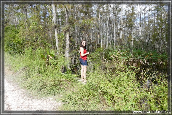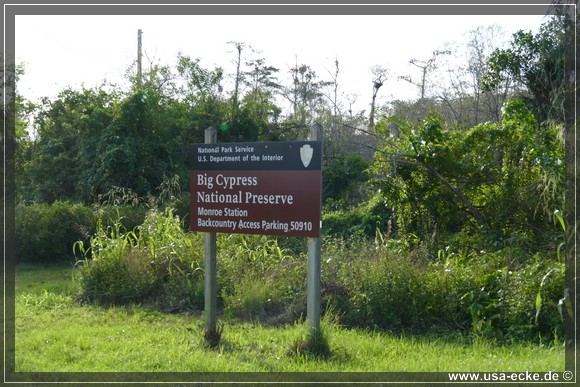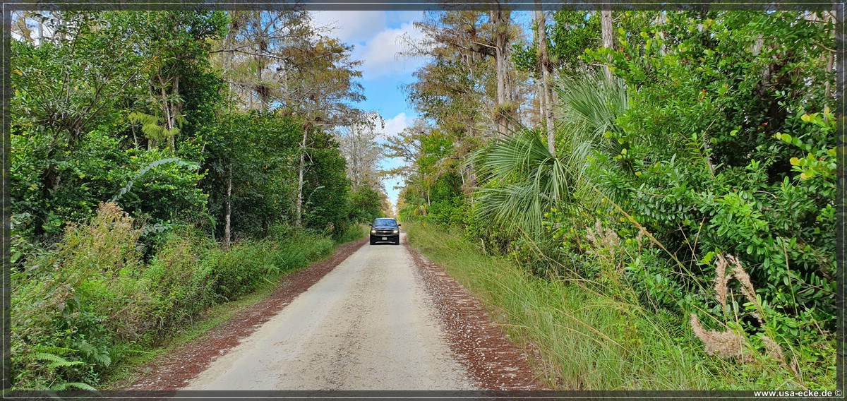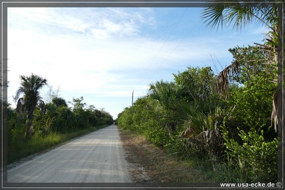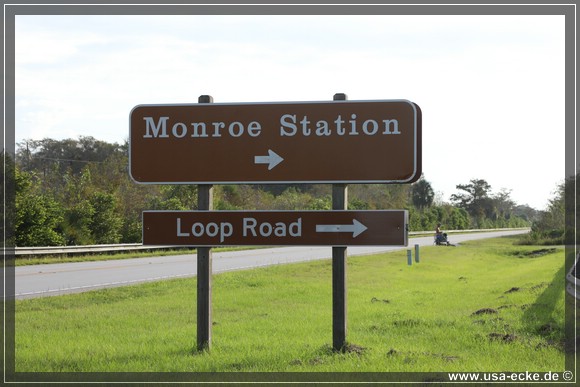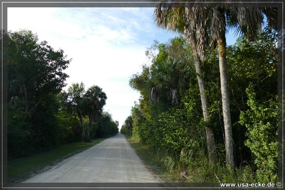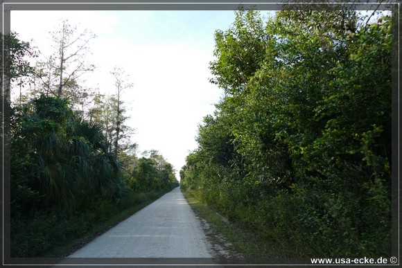 Dann aber fahren wir auf dem Tamiami Trail nach Westen. Unser erstes Ziel fuer heute ist die Loop Road, die wir allerdings nicht als Kreis fahren wollen, sondern nur das geschotterte Stueck der Strasse einmal hin und dann wieder zurueck. Fuer die etwas mehr als 41,5 Meilen vom Hotel bis zur Abzweigung an der Monroe Station braucht man etwa 45 Minuten. |