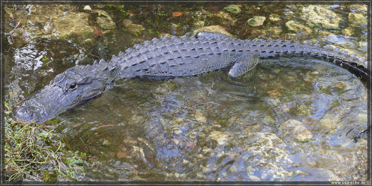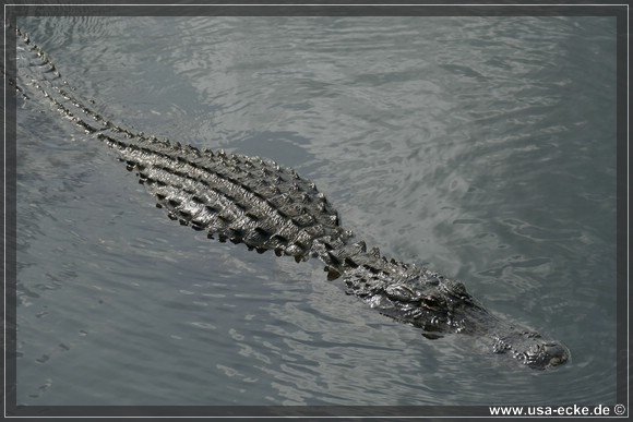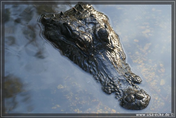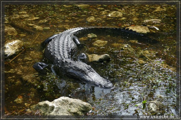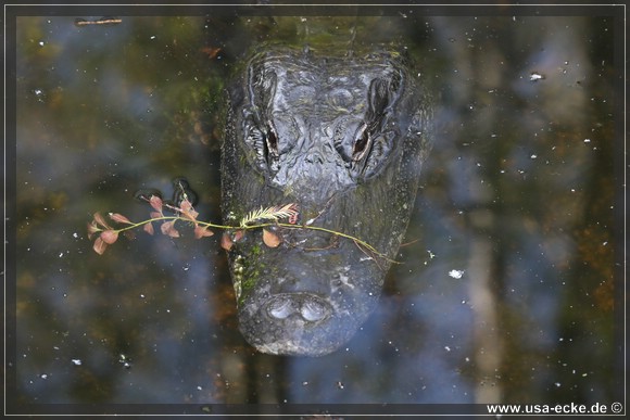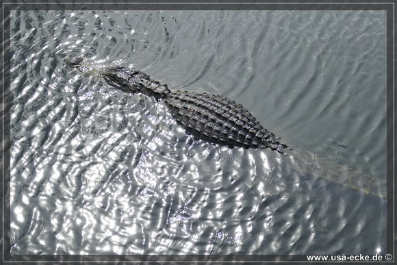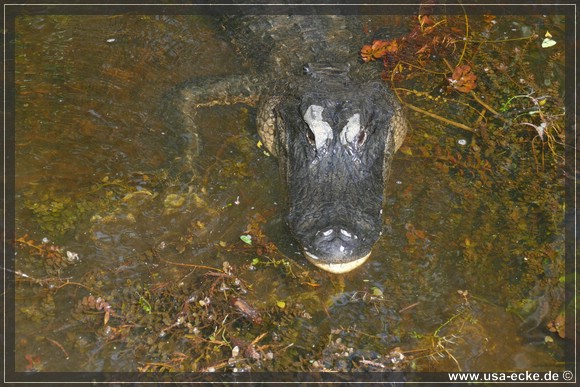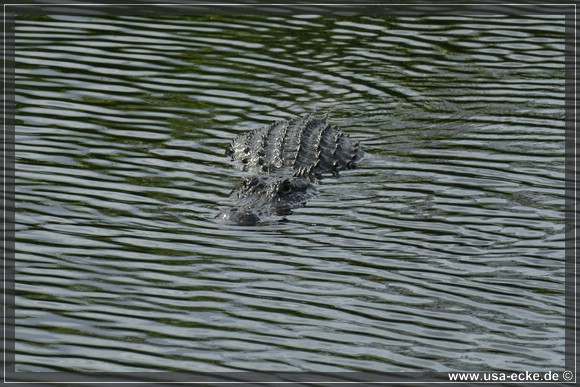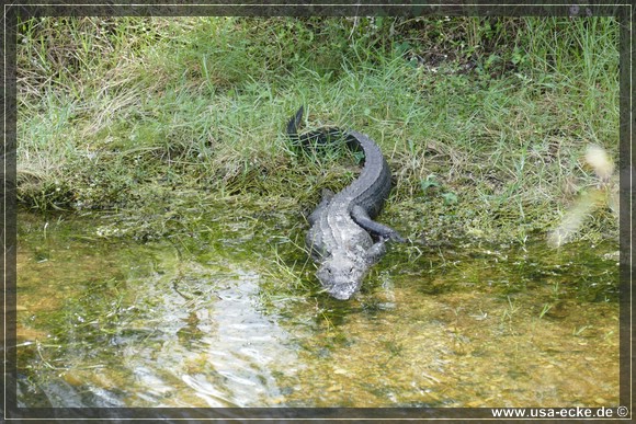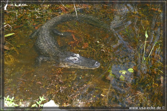 Je weiter wir auf der Loop Road vordringen, desto besser wird es. Nahezu an jedem Wasserloch zeigt sich einer oder mehrere Alligatoren, teilweise auch Exemplare mit stattlicher Groesse. Einer laeuft vor uns ueber die Strasse, allerdings zu weit entfernt fuer richtig gute Fotos. Dafuer wagt sich ein anderer relativ weit aus dem Wasser, um uns zu begruessen. |
