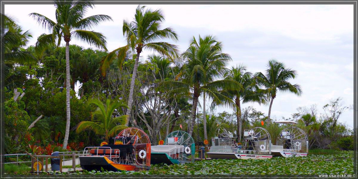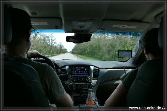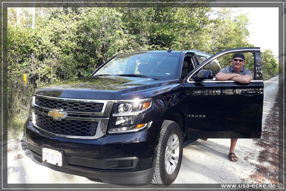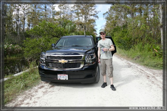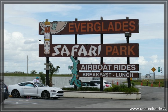 Jetzt uebernimmt Holger das Steuer unseres Tahoe. Auf der Fahrt nach Florida City stoppen wir fuer ein paar Fotos beim Everglades Safari Park, einem Anbieter unter anderem von Airboat Rides. |