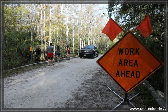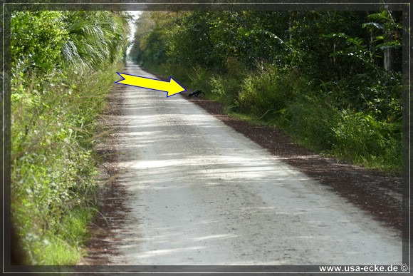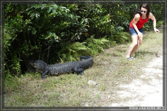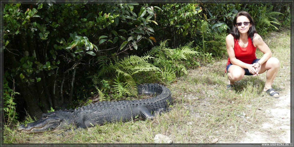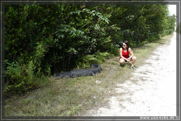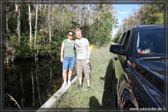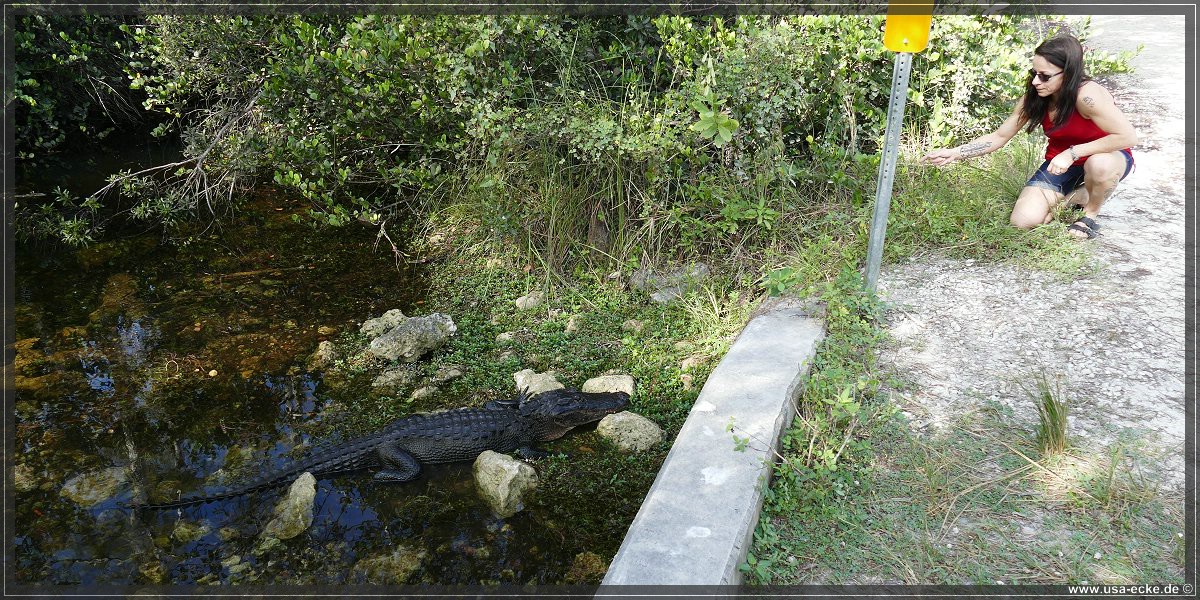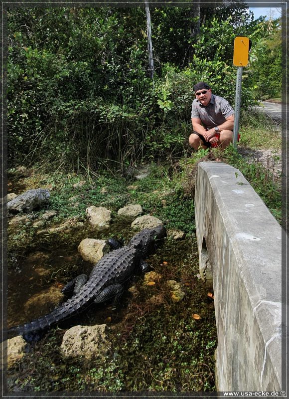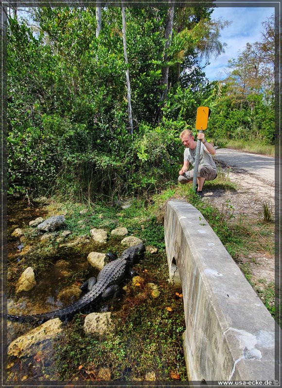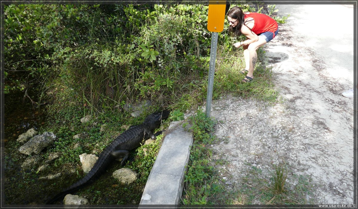 Die Loop Road ist einer der besten Spots, um Alligatoren aus naechster Naehe zu bewundern. Sylvia ist von diesen Tieren mehr als fasziniert und freut sich seit Monaten auf diesen Tag. Der Plan ist, so frueh wie moeglich an der Loop Road anzukommen, denn dann ist die Chance, eventuell Alligatoren sogar auf der Strasse liegen zu sehen, sicher am groessten. Wir waren schon mehrfach hier und haben bisher immer jede Menge Alligatoren gesehen.