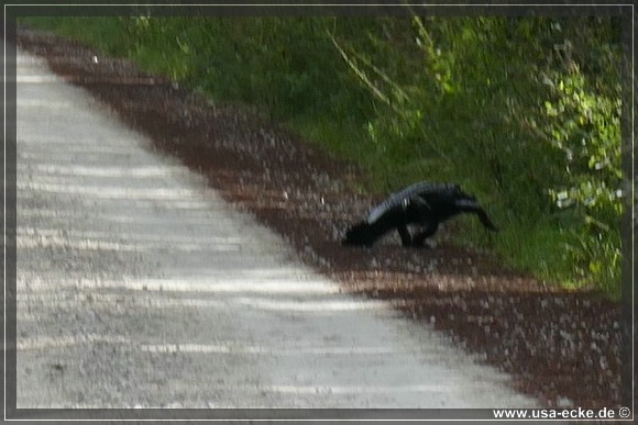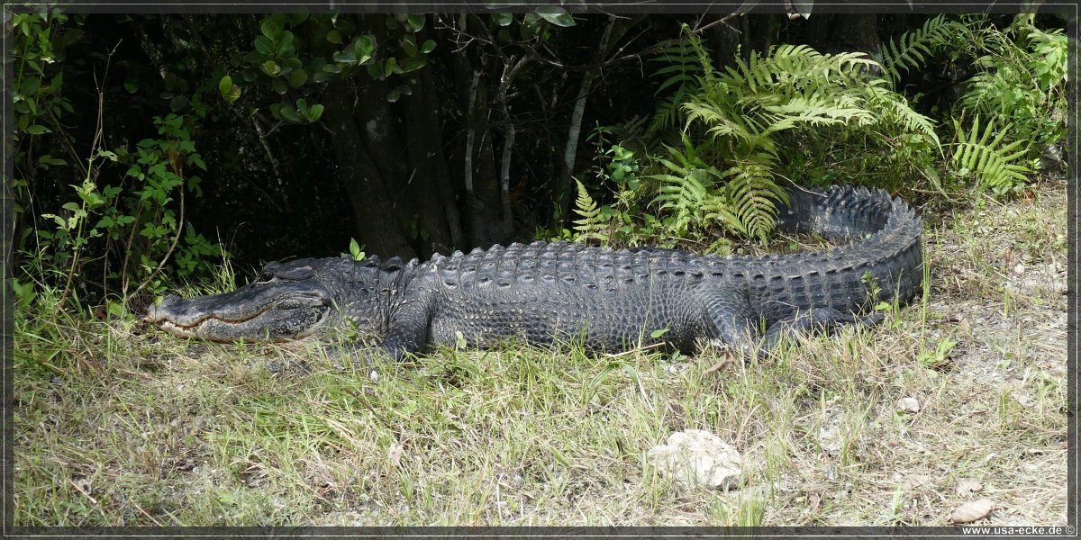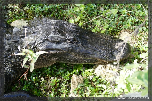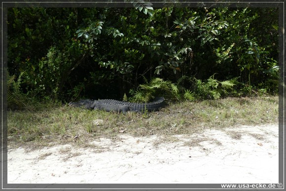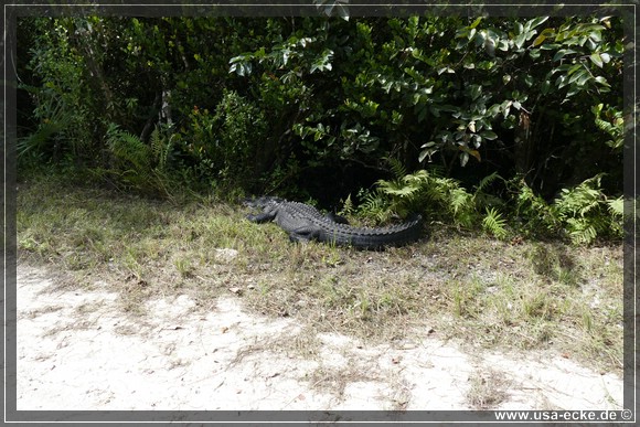 Und dann haben wir doch nochmal richtig Glueck, denn direkt am Strassenrand sehen wir einen relativ grossen Alligator in der Sonne liegen. Er laesst sich auch von den dicht an ihm vorbeifahrenden Autos nicht aus der Ruhe bringen, so ganz gluecklich gewaehlt ist der Platz zum Sonnen eigentlich nicht. Hier koennte er leicht angefahren werden, besonders wenn sich zwei Autos begegnen und etwas auf den Rand ausweichen muessen. |