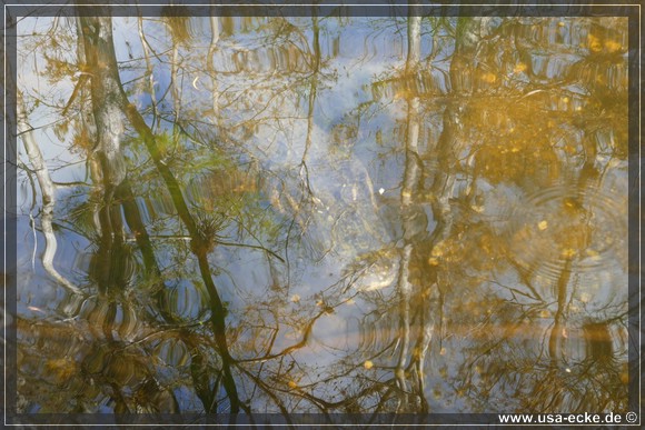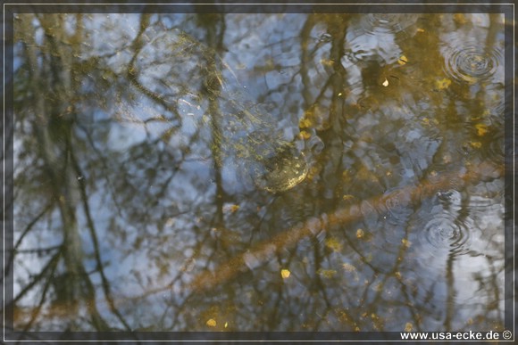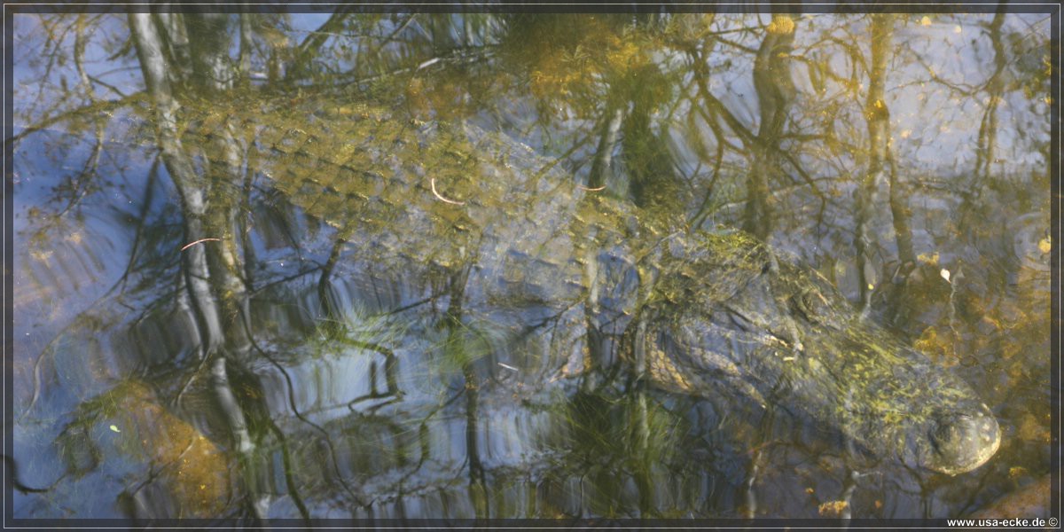 Wie gut getarnt Alligatoren unter Wasser sind, bemerken wir an einem anderen Wasserloch. Auf den ersten Blick ist hier absolut nichts zu sehen, doch dann entdecken wir einen maechtigen Alligator, der unterhalb der Wasseroberflaeche liegt und vor sich hindoest. Oder wartet er nur auf Futter? Oder Touristen? |