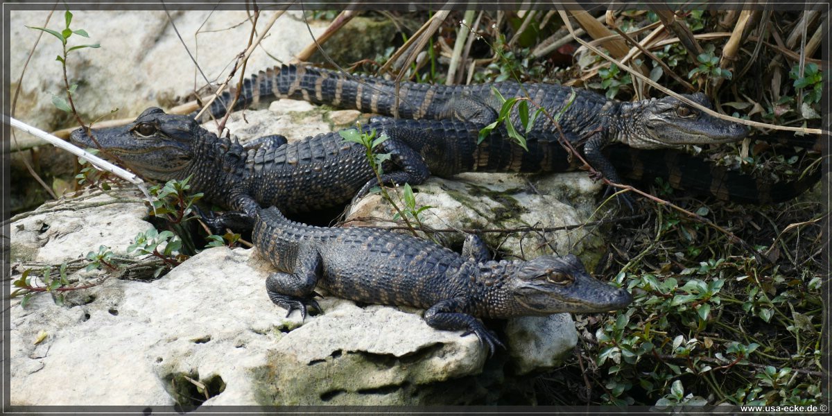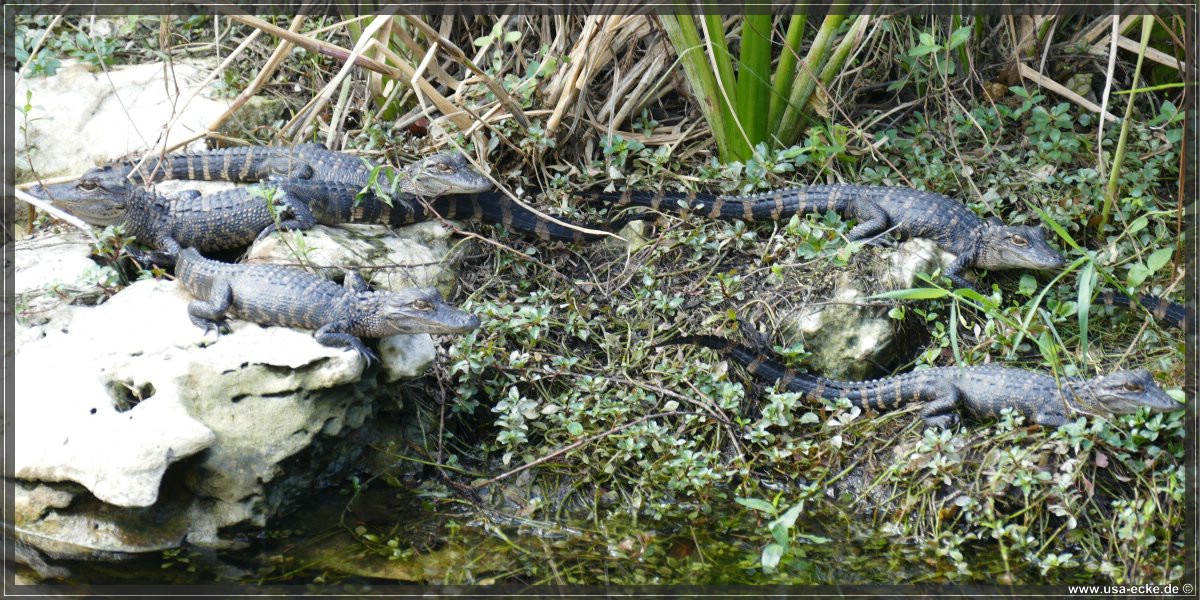 Sogar ein paar Baby-Alligatoren koennen wir bewundern - wirklich klasse! Einige schwimmen im Wasser herum, andere sonnen sich auf den Steinen am Ufer. So gefaellt uns das! |