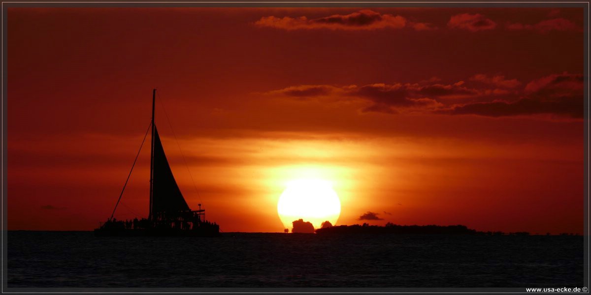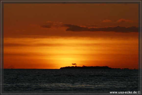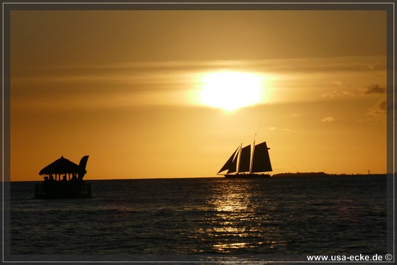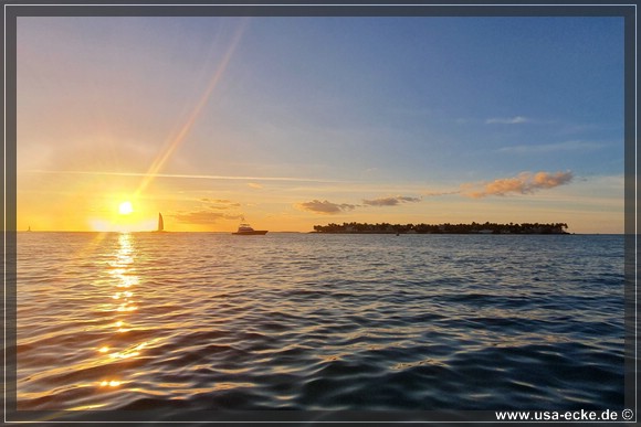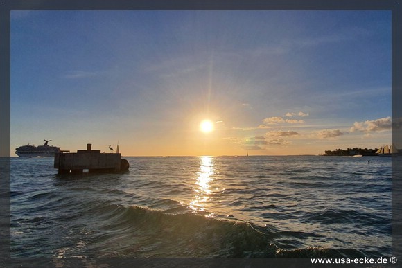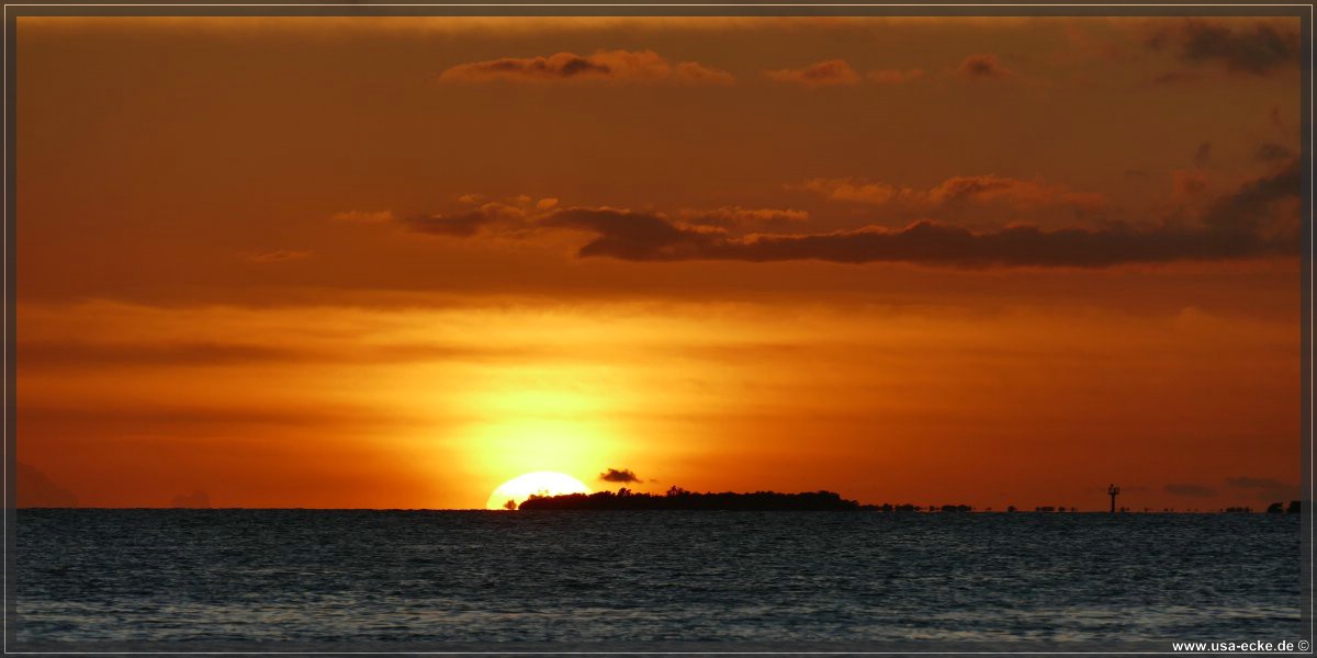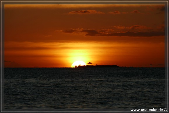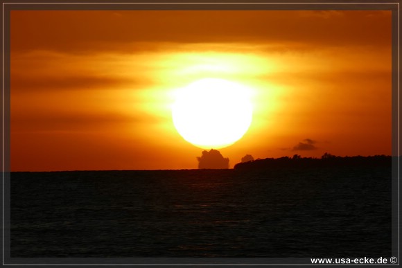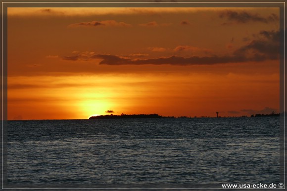 Bereits um kurz nach halb sechs ist es soweit, deutlich frueher als wir es von unseren Sommerreisen gewohnt sind, geht die Sonne am Horizont unter. Jetzt natuerlich nicht hinter Sunset Key, sie faellt schon deutlich vorher ins Wasser. |
