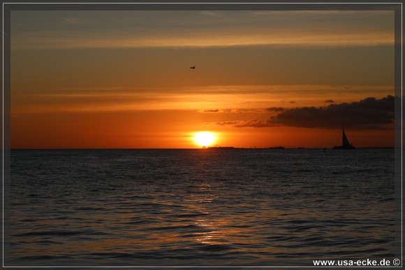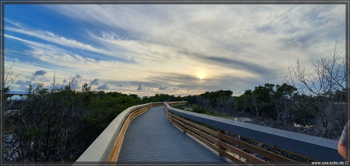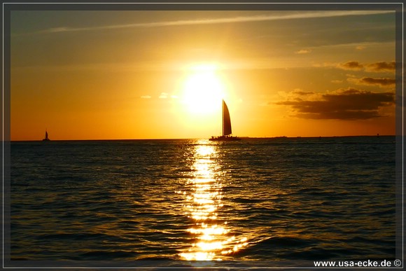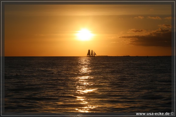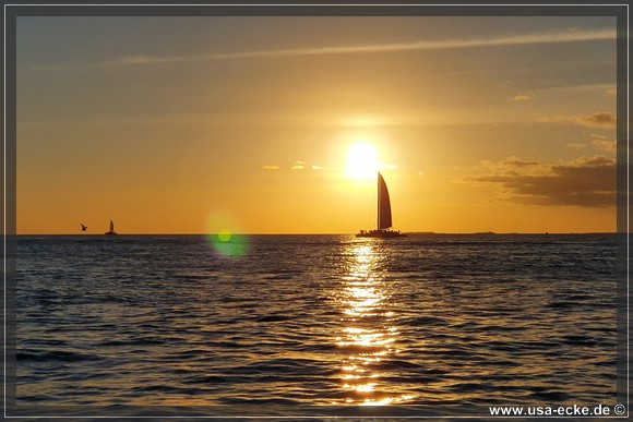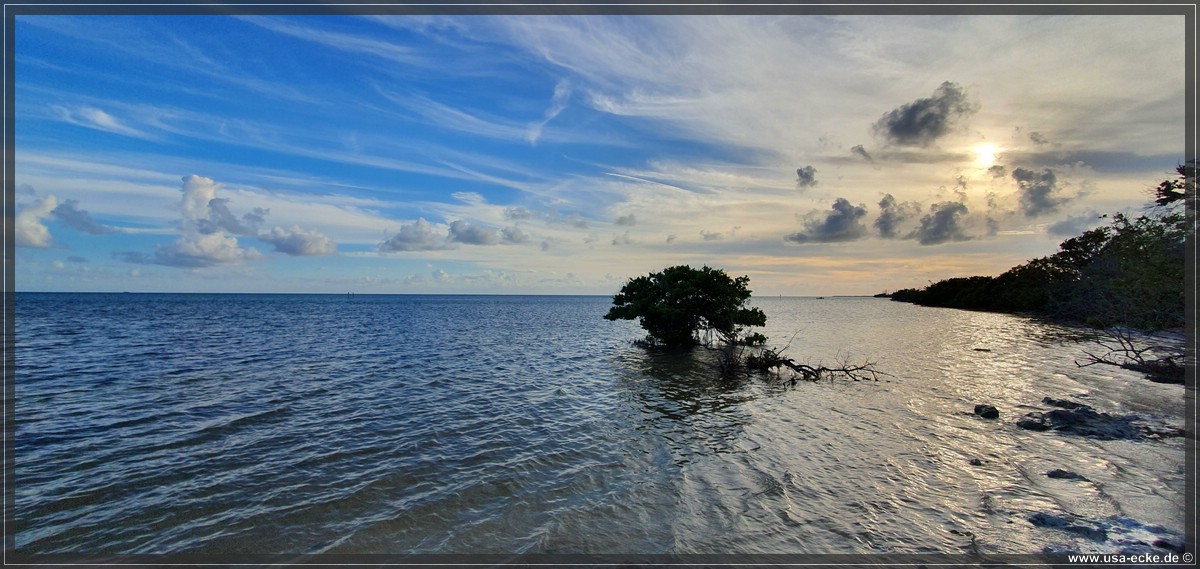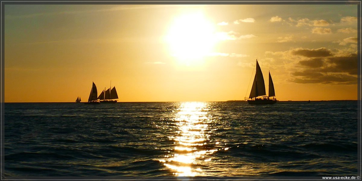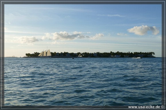 Bereits um kurz nach halb sechs ist es soweit, deutlich frueher als wir es von unseren Sommerreisen gewohnt sind, geht die Sonne am Horizont unter. Jetzt natuerlich nicht hinter Sunset Key, sie faellt schon deutlich vorher ins Wasser. |
