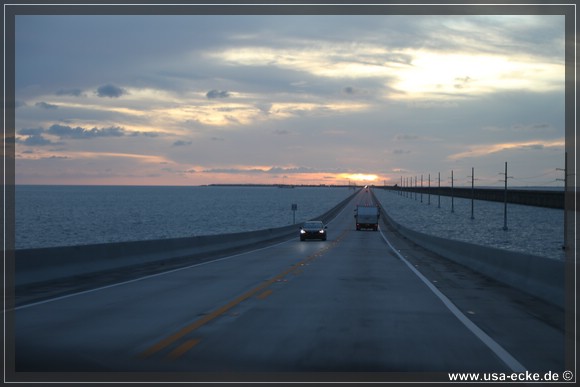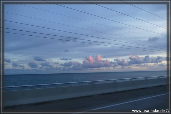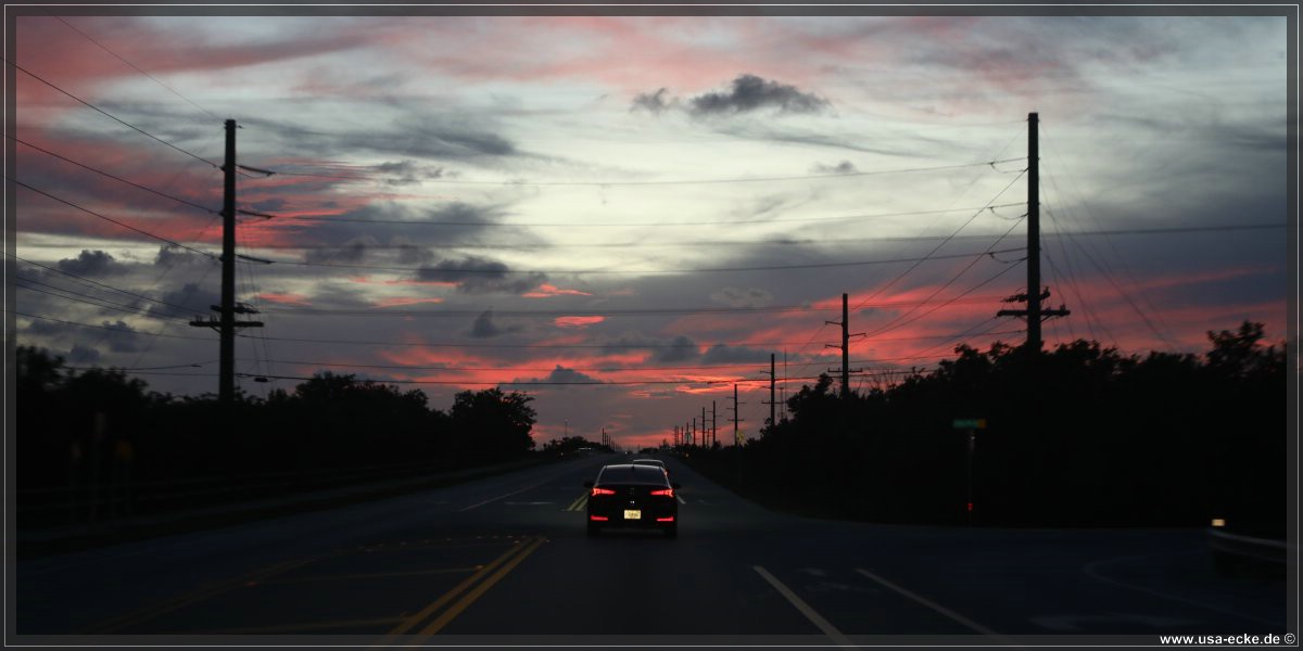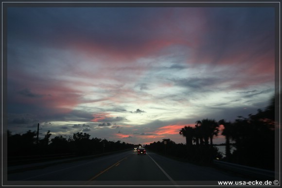 Von weiteren Stopps sehen wir heute ab, um nicht noch spaeter in Key West anzukommen. Der Sonnenuntergang hier ist auch vom Auto aus grandios und so geniessen wir die Fahrt in vollen Zuegen. Wir lieben die Keys einfach, fuer uns hat dieses Fleckchen etwas paradiesisches.