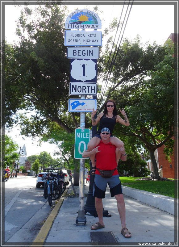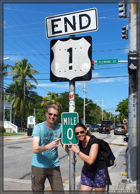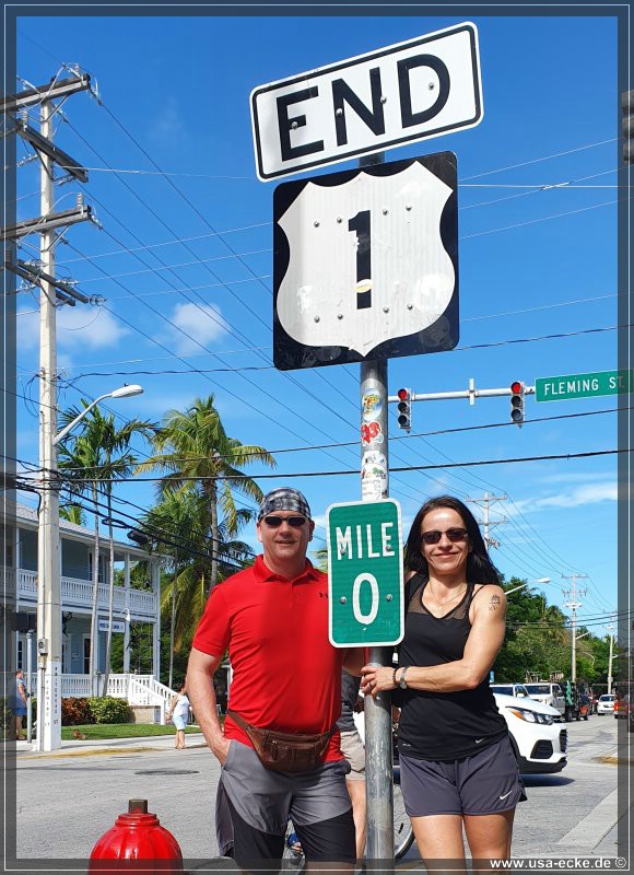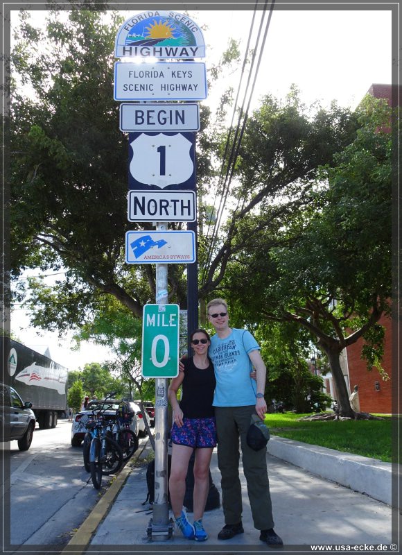 Fast genau um zehn Uhr treten wir in die Pedale und fahren die parallel zur Duval Street verlaufende Whitehead Street hinunter. An der Kreuzung mit der Fleming Street ist unser erster Halt fuer heute: der beruehmte Mile Marker 0 des Highway 1. Von hier fuehrt der Hwy 1 auf einer Laenge von 2.390 Meilen bis nach Fort Kent in Maine hinauf und endet dort erst an der kanadischen Grenze. |
