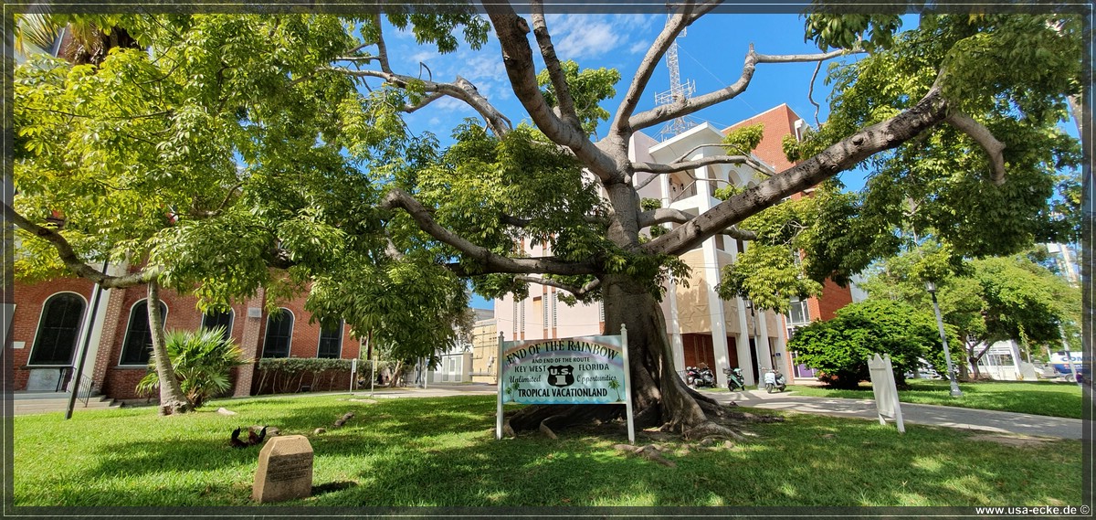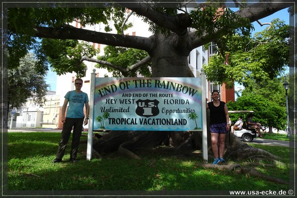 Nur wenige Meter vom Mile Marker 0 entfernt steht der Kapok Tree und darunter ein weiteres tolles Schild zum Ende des Highway 1. Das "End of the rainbow"-Schild findet keine Beachtung, bis wir uns dort fuer unsere Souvenirfotos aufstellen. Dann ist es vorbei mit der Ruhe, ploetzlich wollen alle hier Fotos machen. |