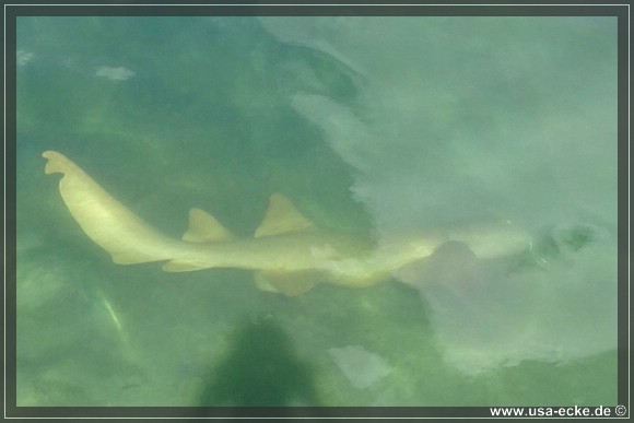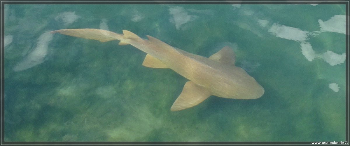 Ploetzlich schwimmt unter uns tatsaechlich ein Hai vorbei! Das schaetzungsweise 1,20 bis 1,40 Meter grosse Tier dreht hier ganz gemuetlich seine Runden. Wir vermuten, dass es sich um einen Nurse Shark, also einen Ammenhai handelt. |