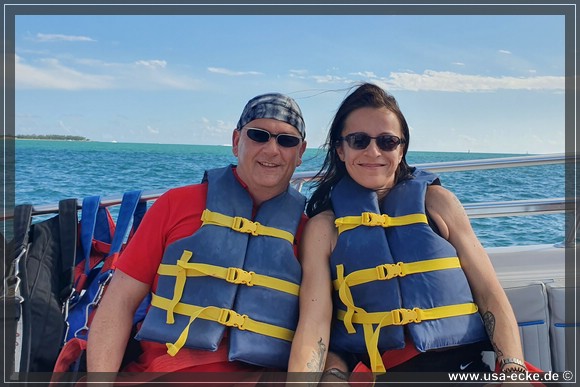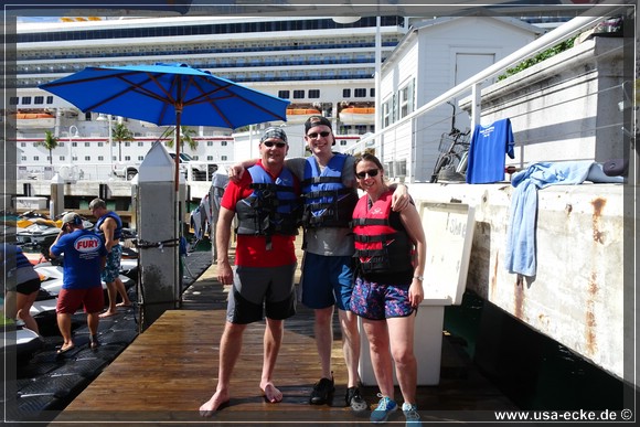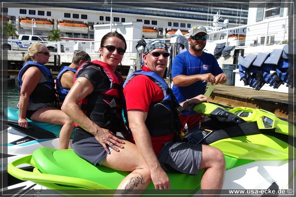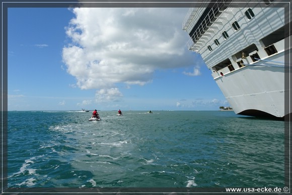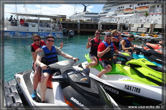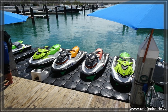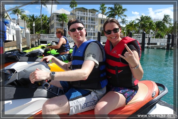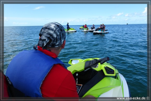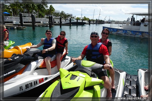Wir ketten unsere Fahrraeder zusammen und laufen zu den kleinen Haeuschen von Fury Water Adventures. Um halb eins startet unsere Jetski-Tour einmal rund um Key West herum. Bei unserer letzten Jetski-Tour waren wir mit unserem Guide alleine unterwegs, dieses Mal besteht unsere Gruppe aus sechs oder sieben Jetskis. |