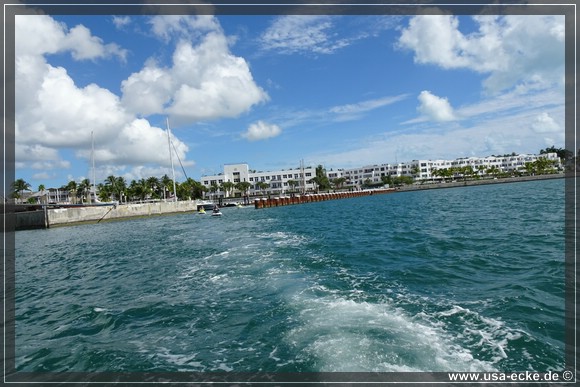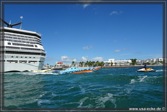 Bei der kurzen Einweisung erklaert uns der Guide, dass wir heute ganz besondere Vorsicht walten lassen muessen. Denn heute sind Trainingsfahrten zur 39. Super Boat World Championship, die morgen genau hier stattfinden. Die Strecke fuer Training und Rennen morgen fuehrt genau am Mallory Square vorbei, also genau da, wo unsere heutige Tour beginnt.