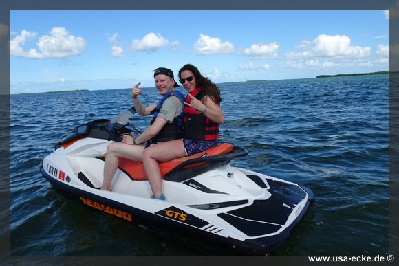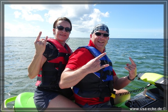 Kurzerhand wird er ans Ende unserer Gruppe verfrachtet und nun sind Sabrina und Holger an erster Stelle, wir gleich dahinter. Holger gibt richtig Stoff und sein Jetski laeuft wirklich unglaublich schnell. Bei Vollgas sind gut 40 Meilen pro Stunde machbar, unserer ist etwas langsamer. Bei 39 Meilen pro Stunde ist Schluss.
