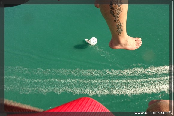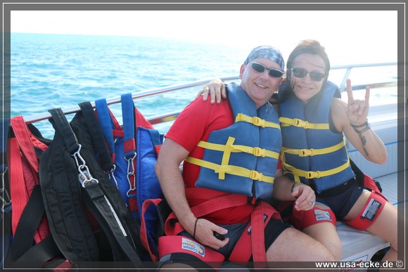 Waehrend Sabrina und Holger nun mit dem Rad weiterfahren, steigen wir im Anschluss an die Jetski-Tour auf ein Boot und fahren hinaus zum Parasailing. |
