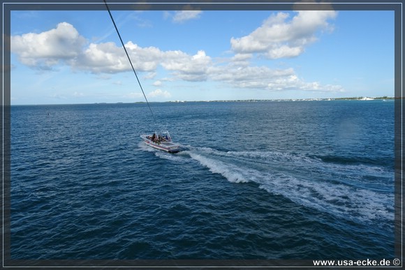 Das letzte Stueck verlangt nochmal alles von uns, denn der Atlantik ist deutlich rauer als der Golf von Mexico! Das ist immer so, doch so schlimm wie heute haben wir das noch nie empfunden. Vollgas ist nicht möglich, dazu sind die Wellen zu hoch. Immer wieder werden wir aus dem Wasser katapultiert, Sabrina und Sylvia haben Muehe, sich an uns festzuhalten.