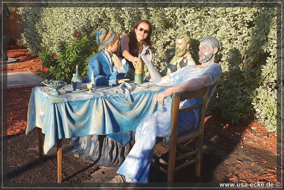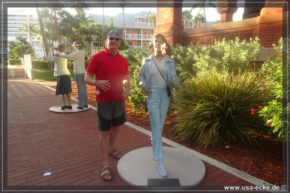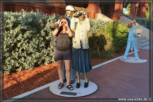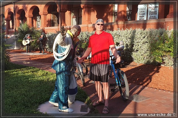 Gegen vier Uhr sind wir wieder zurueck und radeln nun einfach noch ein wenig durch Key West. Nach einem schnellen Imbiss bei "The Conch Shack" und einem kurzen Stopp im "Ron Jon Surf Shop" fahren wir wieder zum Mallory Square. Hinter dem Gebaeude der Art & Historical Society sind wie bei unserem letzten Besuchen auch einige Figuren aufgestellt, die wir natuerlich wieder etwas genauer ansehen wollen.