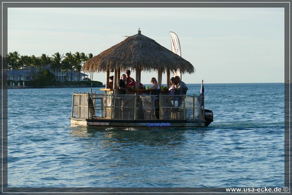 Ein paar Mal faehrt vor uns auch die Tiki-Bar vorbei, die wir auf der Sandbank gesehen haben. Oder besser eine der Tiki-Bars… davon gibt es scheinbar mehrere und sie haben einen Aussenborder, sind also nicht darauf angewiesen, irgendwo hingeschleppt zu werden. |