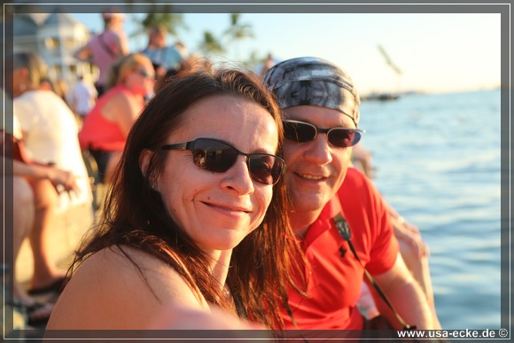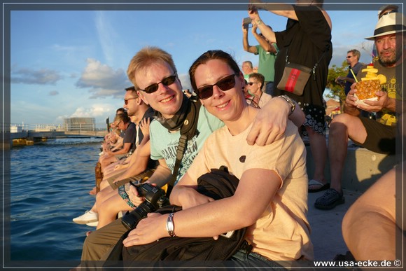 Ein paar Meter weiter treffen wir uns gegen fuenf Uhr wieder mit Holger und Sabrina, um den beruehmten Sonnenuntergang von Key West anzusehen. Man sagt, es waere der schoenste Sonnenuntergang der Welt. Daher kommt auch der Slogan: Key West – Home of the sunset. Wir ketten unsere Fahrraeder wieder an, setzen uns ganz vorne ans Meer und sehen der Carnival Glory erstmal beim Ablegen zu. |