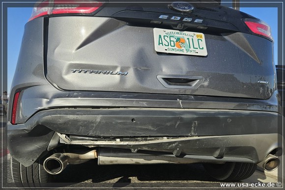 Die Freude, dass wir schnell einen Bus bekommen haben, waehrt allerdings nur kurz. Unser Busfahrer baut auf dem Weg zu Alamo noch direkt am Airport einen Unfall, sodass es wieder Verzoegerungen gibt. Kurzfristig muessen alle sogar aussteigen und man erklaert uns, dass ein Ersatzbus kommen und uns abholen wird.