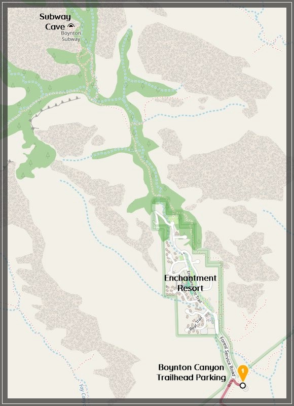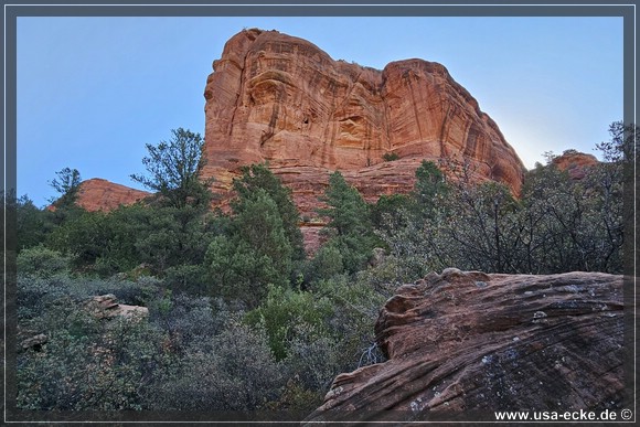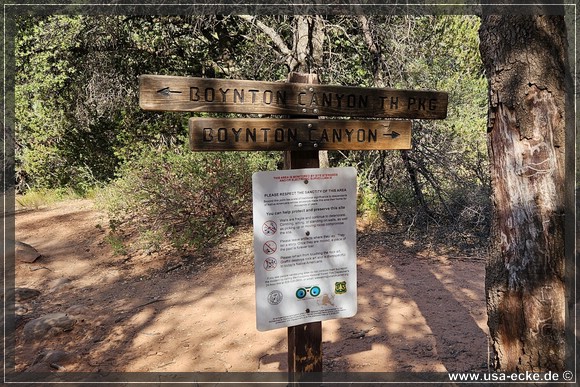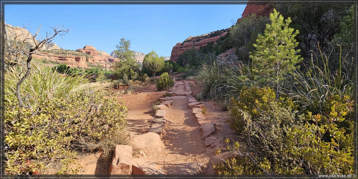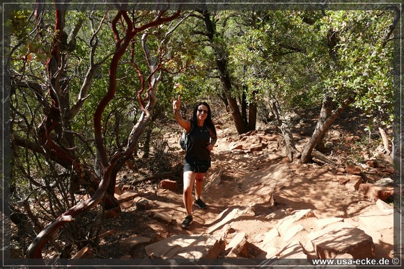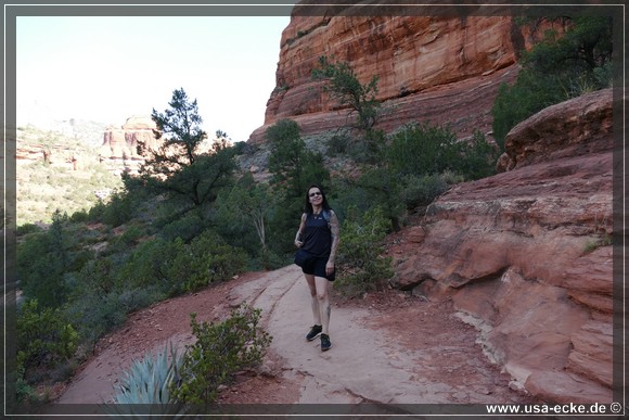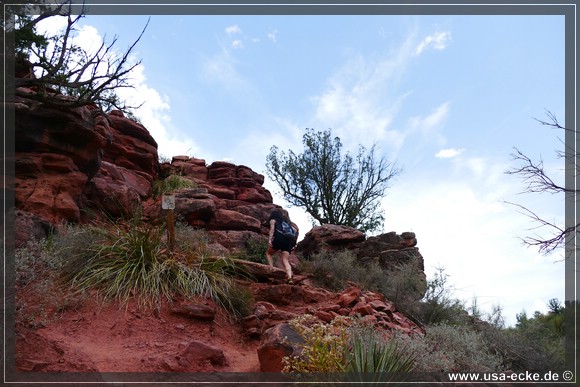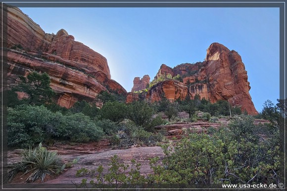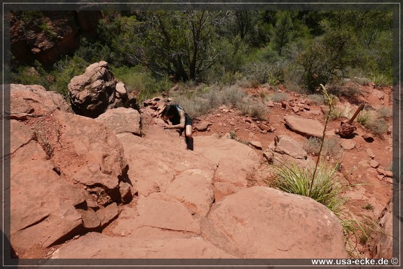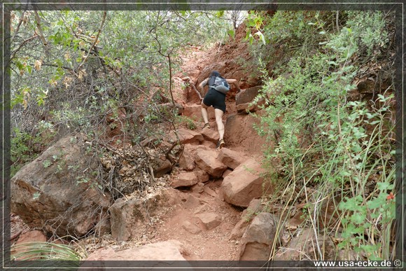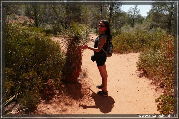 Der Bonyton Canyon Trail, auf den wir dann wechseln, ist wirklich klasse. Er fuehrt am Enchantment Resort entlang in Richtung Canyon und ist landschaftlich wunderschoen. Die meiste Zeit hat man hier aufgrund der Vegetation und der Felsen einen prima Schatten, was in der Sommerhitze unglaublich angenehm ist. So frueh am Morgen ist es zwar noch nicht ganz so heiss, aber die Temperaturen steigen quasi minuetlich. |