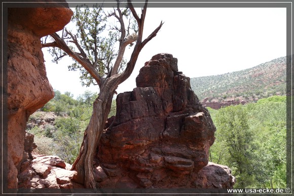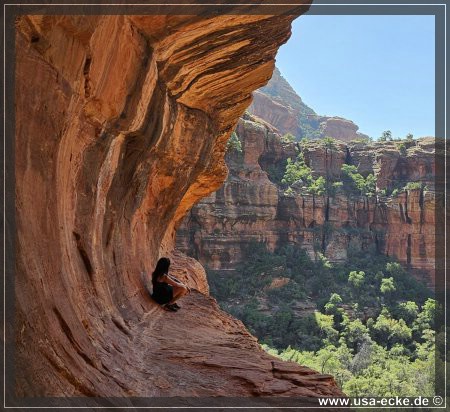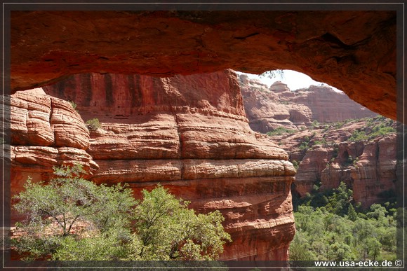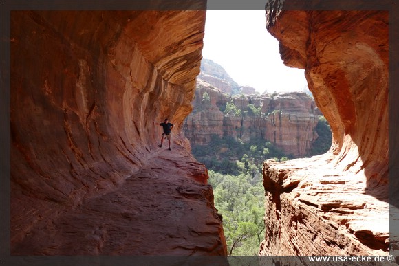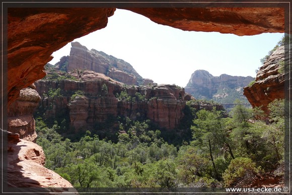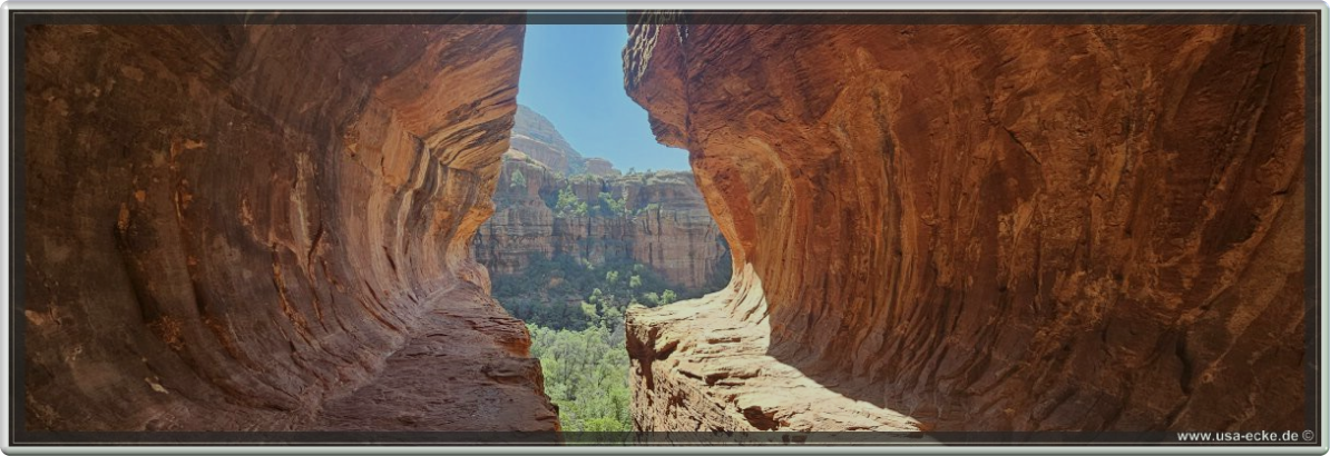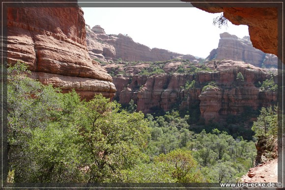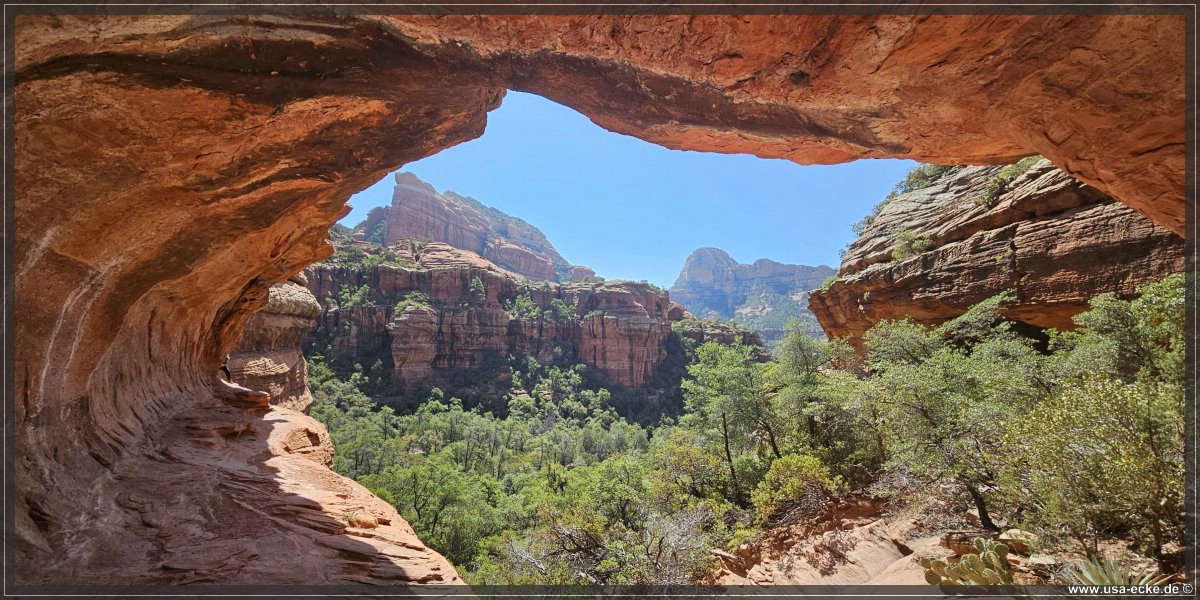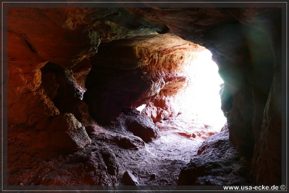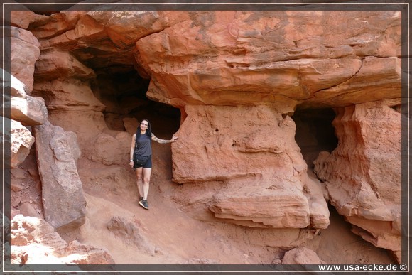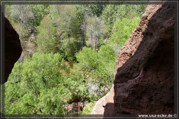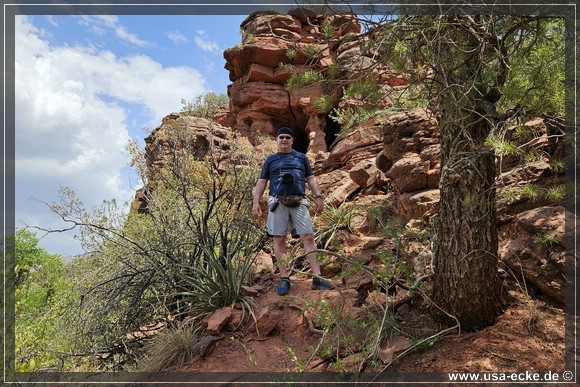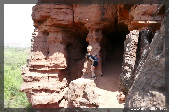 Gegen 13.45 Uhr brechen wir zu unserem naechsten kleinen Hike auf. Der liegt nur etwa eineinhalb Meilen suedlich des Arabella und ist wirklich klein. Der kurze Trail zu den Raven Caves, die gelegentlich auch Oak Creek Caves oder sogar Sedona Caves genannt werden, dauert keine zehn Minuten. |