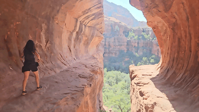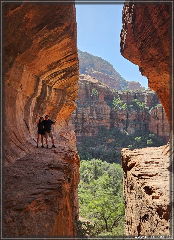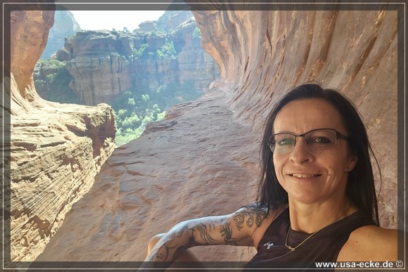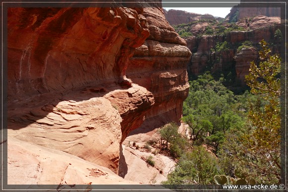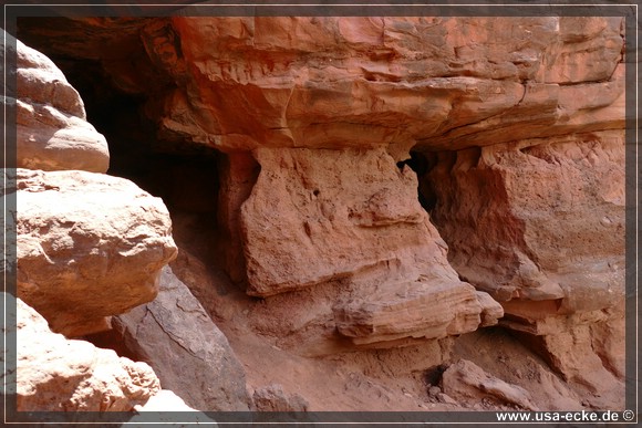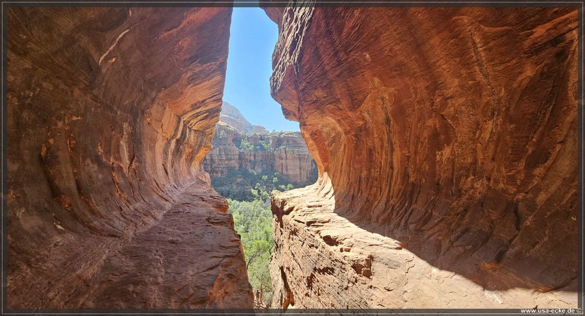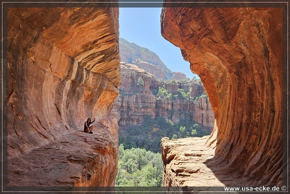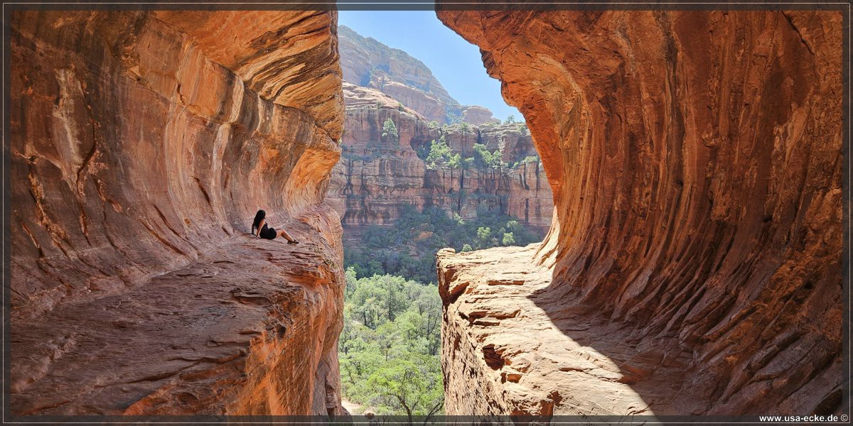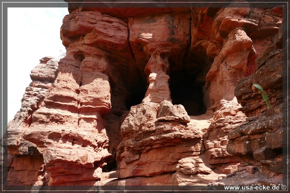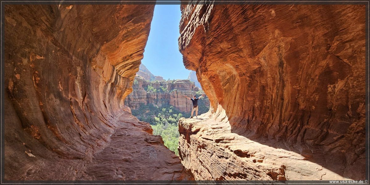 Gegen 13.45 Uhr brechen wir zu unserem naechsten kleinen Hike auf. Der liegt nur etwa eineinhalb Meilen suedlich des Arabella und ist wirklich klein. Der kurze Trail zu den Raven Caves, die gelegentlich auch Oak Creek Caves oder sogar Sedona Caves genannt werden, dauert keine zehn Minuten. |