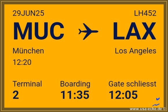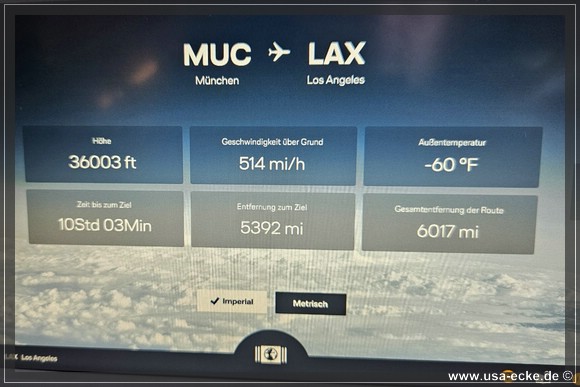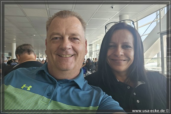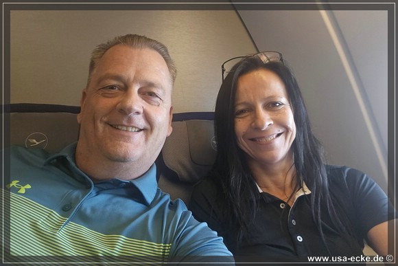 Unsere Freunde Sabrina und Holger, die 2019 mit uns gemeinsam schon in Florida unterwegs waren (Reisebericht Rock the Keys 2019), sind fast zeitglich mit uns von Frankfurt aus gestartet. Allerdings fliegen sie mit Condor nach Las Vegas, waehrend unser Flug von Muenchen nach Los Angeles geht. Die Flugrouten sind sehr aehnlich, waeren wir nicht mit Verspaetung gestartet, haetten wir uns quasi fast zuwinken koennen. So hecheln wir immer etwas hinterher. |