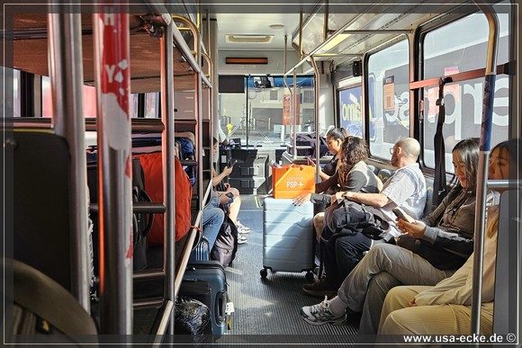 Fuer uns wohl das letzte Mal steigen wir in den Shuttle-Bus von Alamo, denn ab dem kommenden Jahr werden keine Busse mehr eingesetzt. Alle Mietwagenanbieter ziehen dann in das brandneue Rental Car Center um, das mit einer Monorail an den Airport angebunden wird – ganz aehnlich wohl wie in Miami.