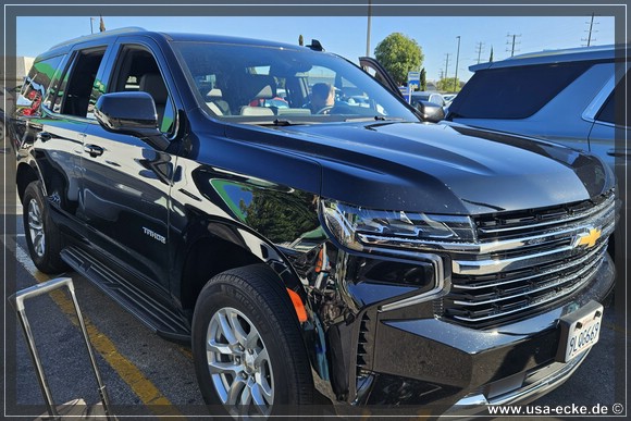 Uns wird versprochen, dass ein Chevrolet Tahoe unterwegs ist, den bekommen dann wir. Gut, dann warten wir eben. Als er nach ein paar Minuten gebracht wird, sind wir nicht unzufrieden. Der schwarze Monster-SUV hat 35.000 Meilen auf dem Tacho und ist ganz gut in Schuss. Leider nicht mehr ganz neu und ohne Allrad und Sirius XM, aber ansonsten mit allem, was wir uns wuenschen. Den nehmen wir – eine andere Wahl haben wir eh nicht. |
