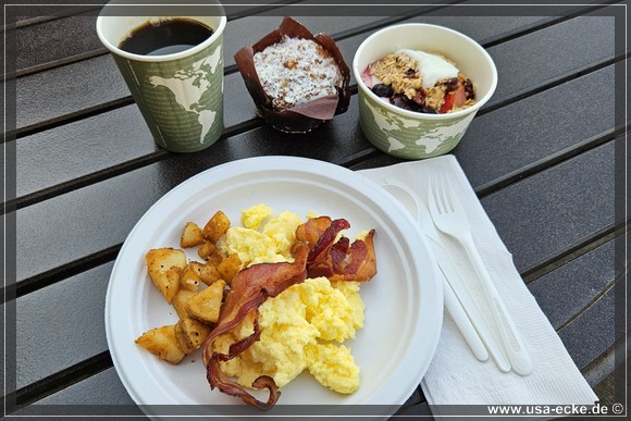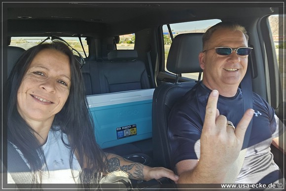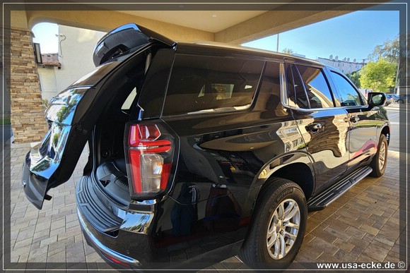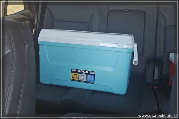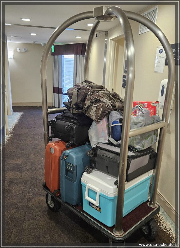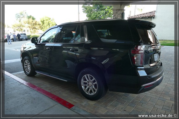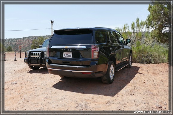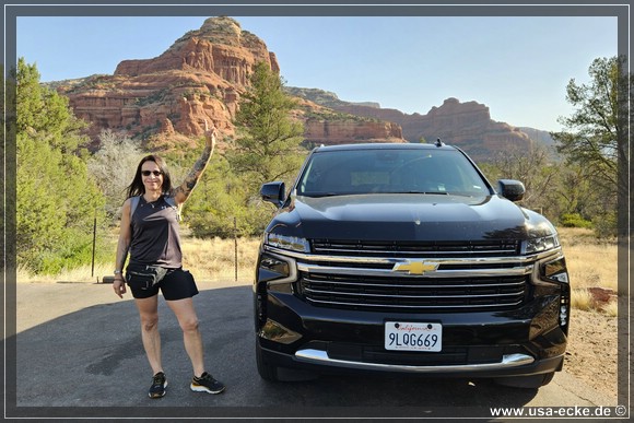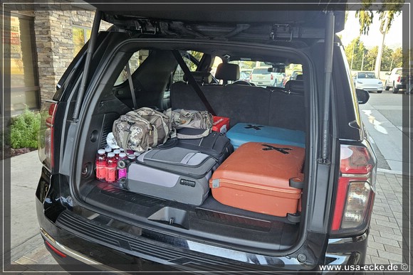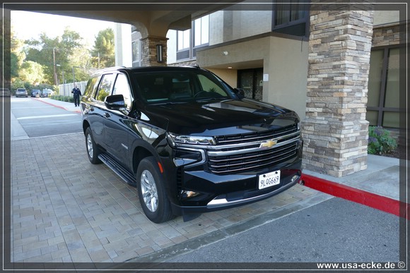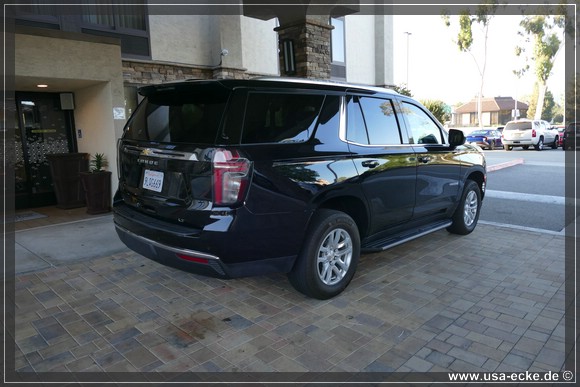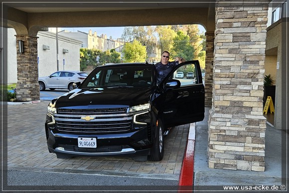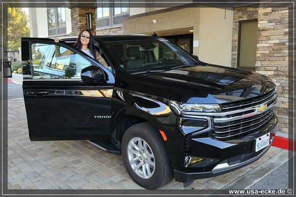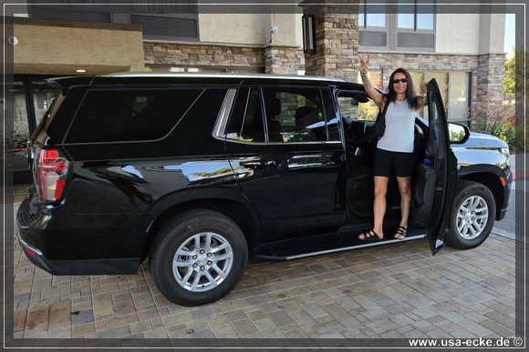 Schnell packen wir unsere sieben Sachen auf den Gepaeckwagen des Hotels, verladen alles in den riesigen Kofferraum unseres Tahoe – naja, fast alles, die Kuehlbox kommt auf den Ruecksitz – und knipsen noch ein paar Fotos vom Auto. Um kurz nach sieben starten wir unsere heutige Tour. |