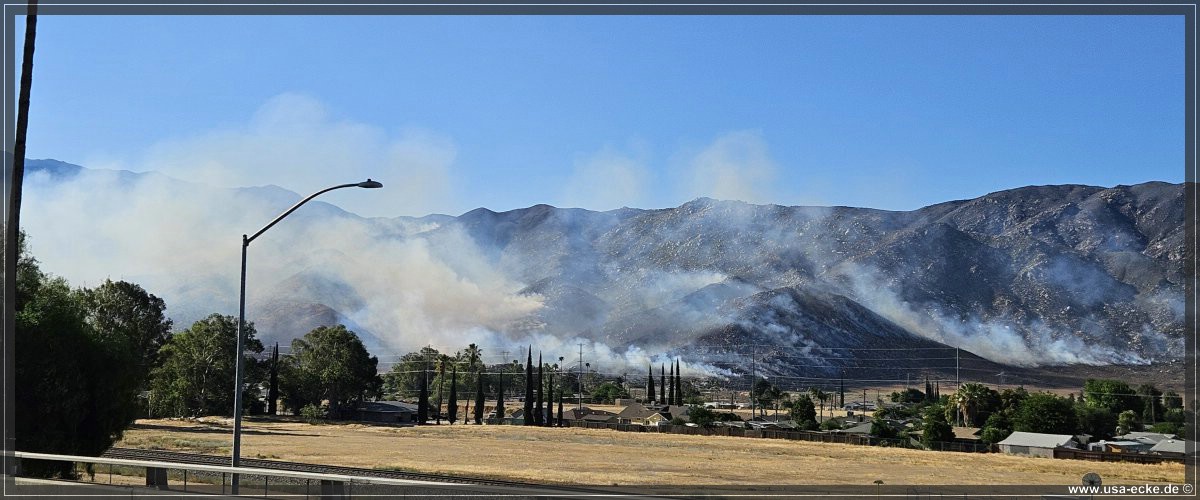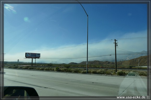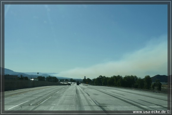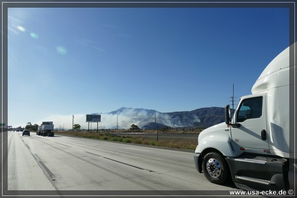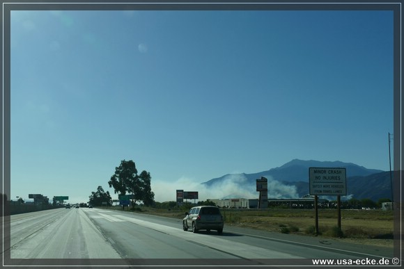 Der Verkehr haelt sich in Grenzen und so kommen wir ganz gut voran. Kurz vor Banning sehen wir Rauch aufsteigen, rechts neben der Interstate 10 brennt es in den naheliegenden Huegeln. Die Flaeche ist relativ gross, eine Gefahr fuer den Ort scheint davon jedoch nicht auszugehen. |