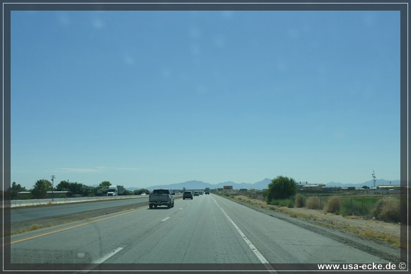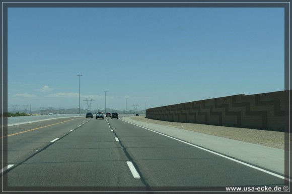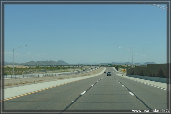 Um viertel vor elf geht es weiter und nun uebernehme ich das Steuer. Wir fahren weiter auf der Interstate 10 bis kurz vor Phoenix, wo wir auf die Arizona State Route 303, auch bekannt als Loop 303 wechseln. Im Prinzip ist der Highway eine grossraeumige Ortsumfahrung fuer den gesamten Grossraum Phoenix. Noerdlich der Metropolregion endet die Umgehung und man erreicht die Interstate 17, die in Nord-Sued-Richtung verlaeuft. |