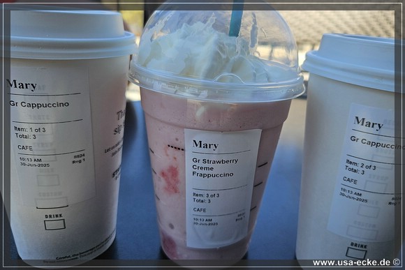 Unser erster Stop heute ist wie im letzten Jahr bei Starbucks, wo wir uns um 10.00 Uhr einen Cappu goennen. Und Mary bekommt einen Strawberry Frappucino obendrauf. Ach ja – Mary bin ja ich. Also zumindest bei Starbucks. Und hier ganz besonders. Denn letztes Mal war ich hier die liebe Cynthia… Keine Ahnung, wieso man bei Starbucks Sylvia nicht versteht. Aber Mary hat man bisher immer verstanden, deswegen bin ich ab jetzt die Mary! Jawoll. |
