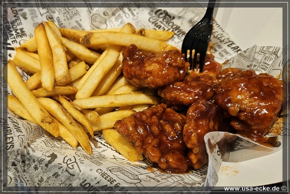 Gegen 13.00 Uhr erreichen wir die North Premium Outlets Phoenix und nach mehr als zwei Stunden Fahrt hab ich jetzt erstmal Hunger. Im Food Court futtern wir bei Philli Steaks leckere Kaese-Fries und Boneless Wings – vooooll leckaaa! |