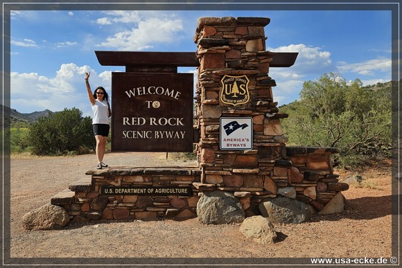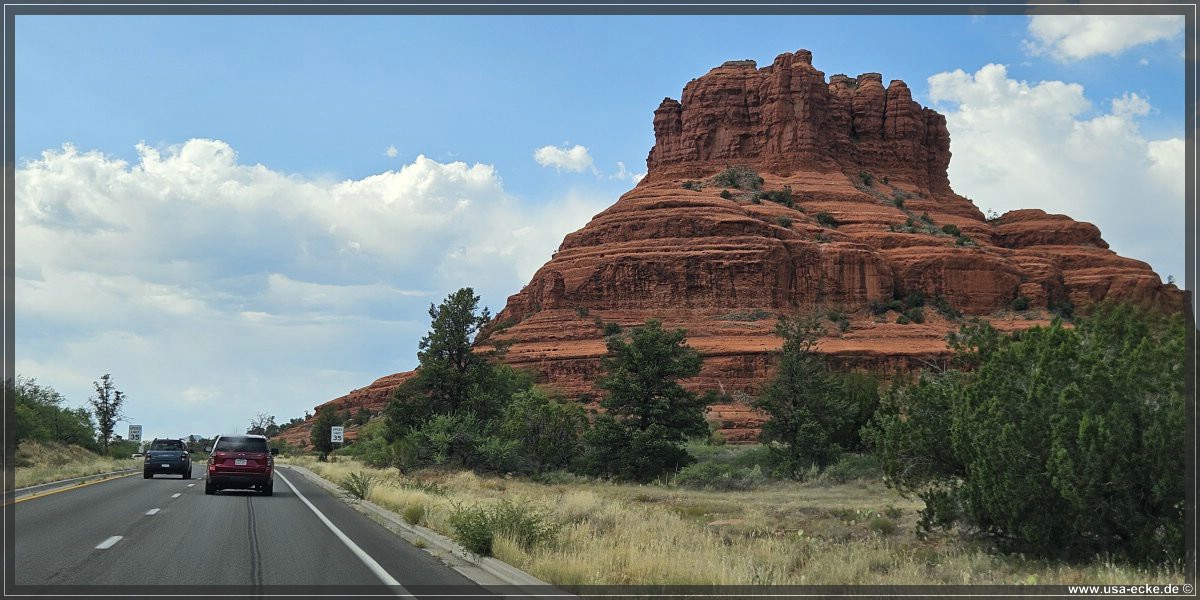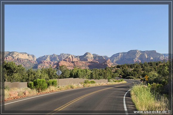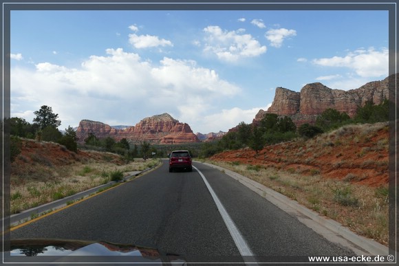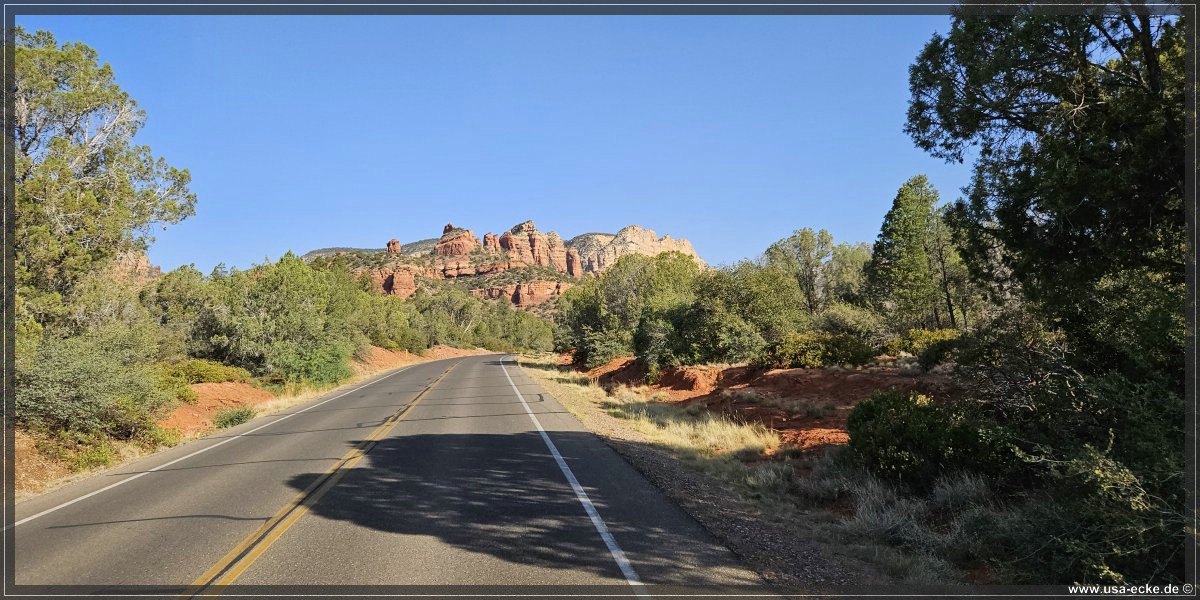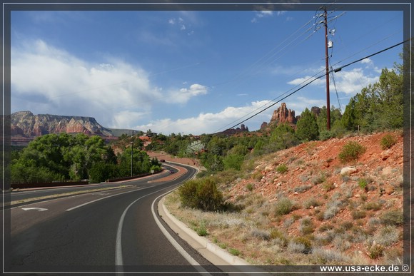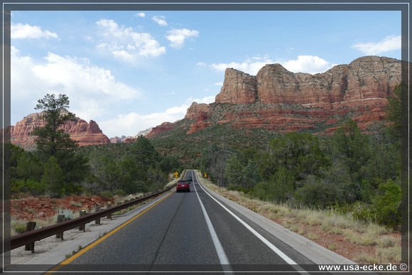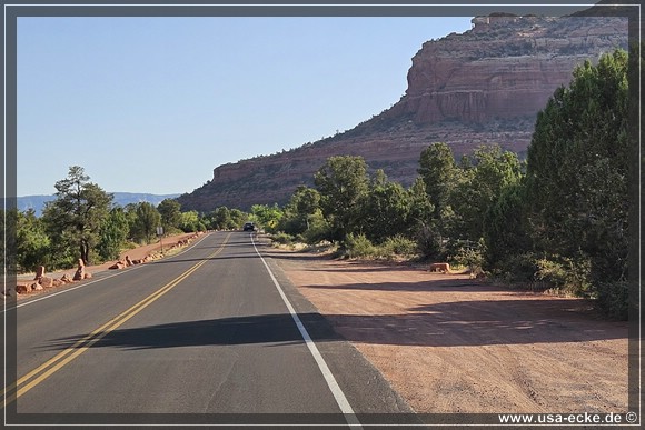 Das letzte Stueck unserer heutigen Strecke verlaeuft ueber den Hwy 179, der auch als Red Rock Scenic Byway bekannt ist. Dieser tolle Strassenabschnitt kurz vor Sedona ist sogar eine All American Road und das voellig zu Recht. |