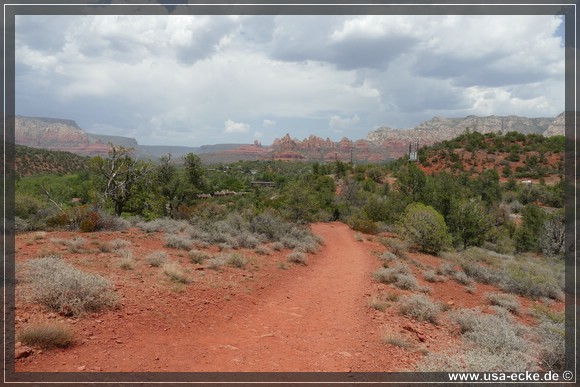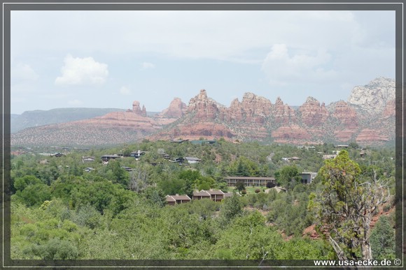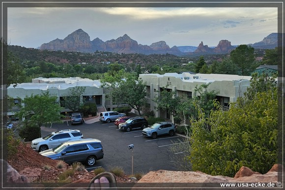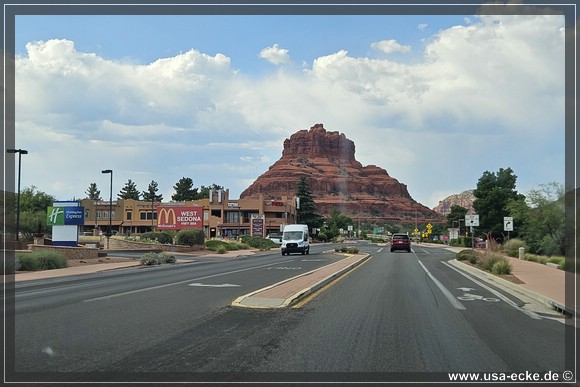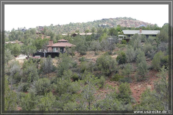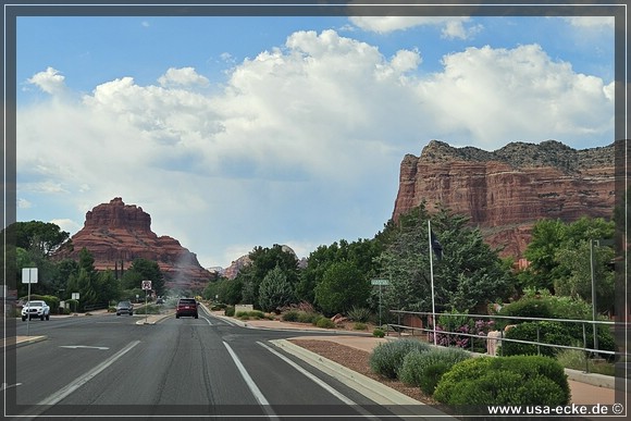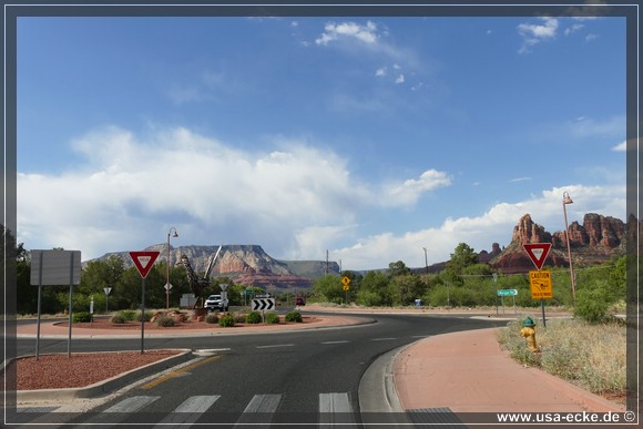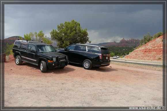 Eigentlich wollten wir nun zu den Touristengeschaeften in Upper Sedona, doch ein unangenehmer Wind und Regen verhindern, dass wir aus unserem Tahoe aussteigen koennen. Naja, vielleicht koennen wir spaeter noch hierher, so spaet ist es ja noch gar nicht.