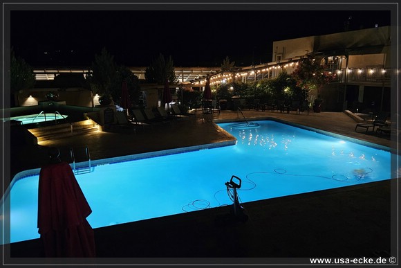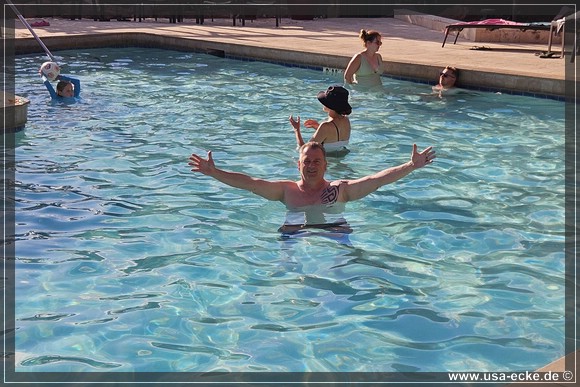 Schnell packen wir unser Gepaeck aufs Zimmer und springen dann erstmal in den Pool. Eine Stunde nehmen wir uns Zeit, um uns von der fast 750 km langen Fahrt etwas zu erholen, dann aber macht sich der Hunger bemerkbar. |