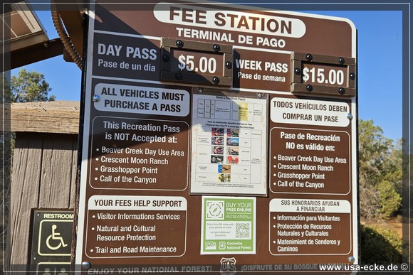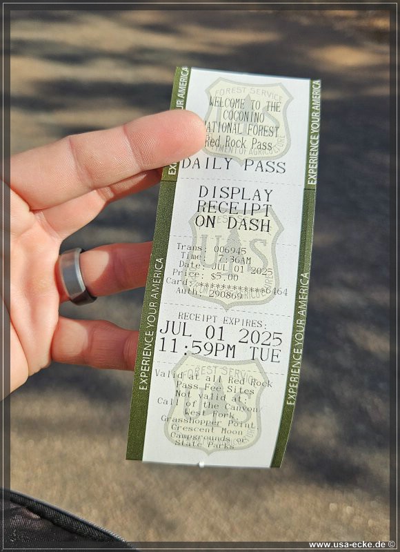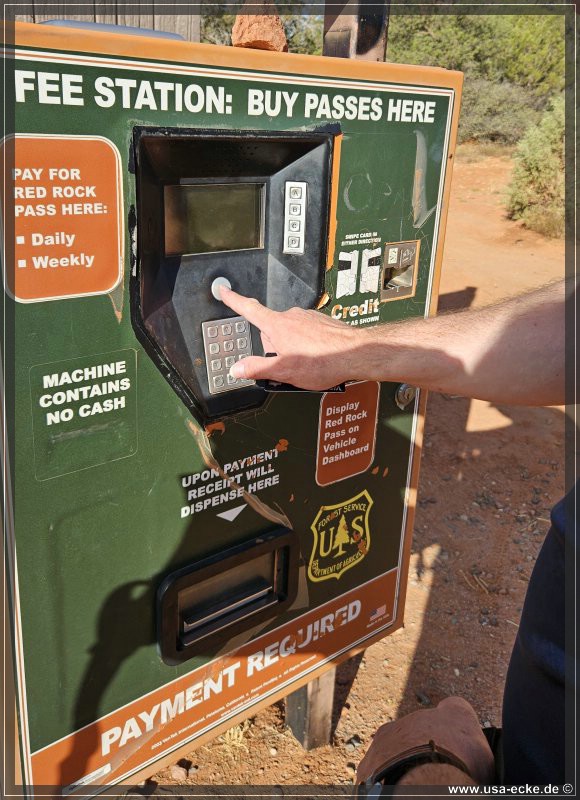 Doch um halb acht ist hier noch nicht viel los, nur wenige Autos sind bisher auf dem Parkplatz angekommen. Zunaechst kaufen wir uns den Red Rock Pass, der fuer einen Tag nur fuenf Dollar kostet. Der gilt heute dann nicht nur hier, sondern an vielen anderen Parkplaetzen rund um Sedona ebenfalls. |