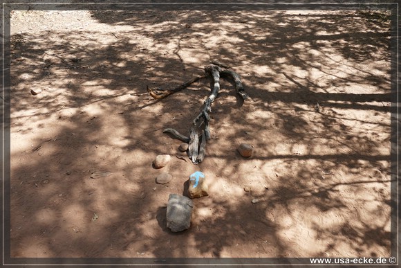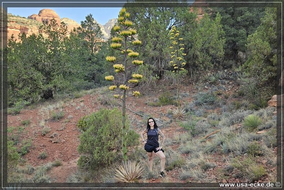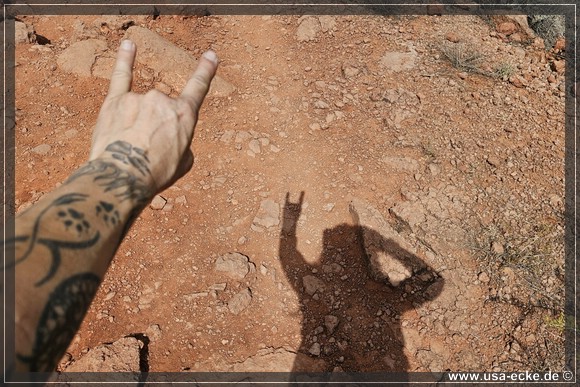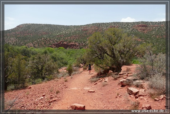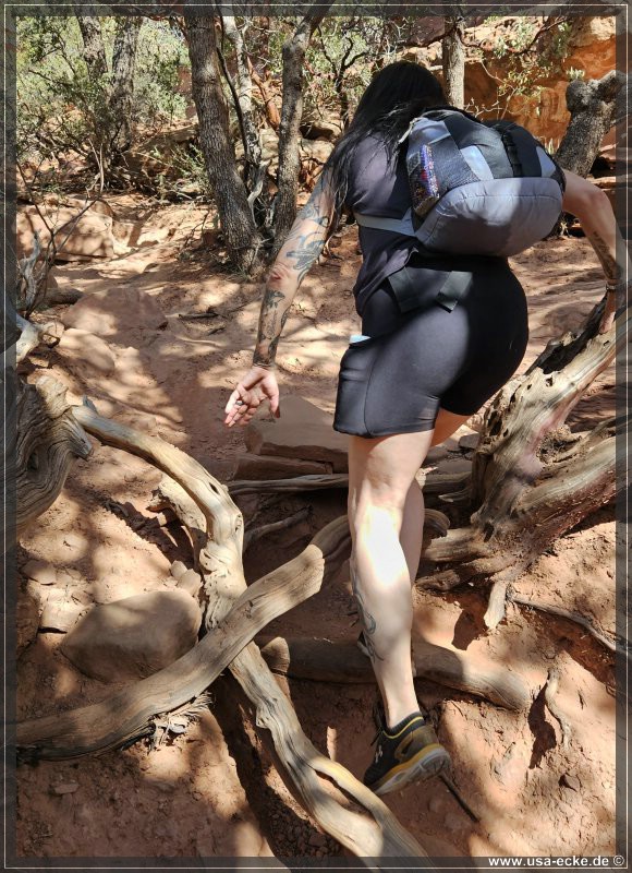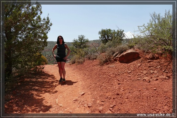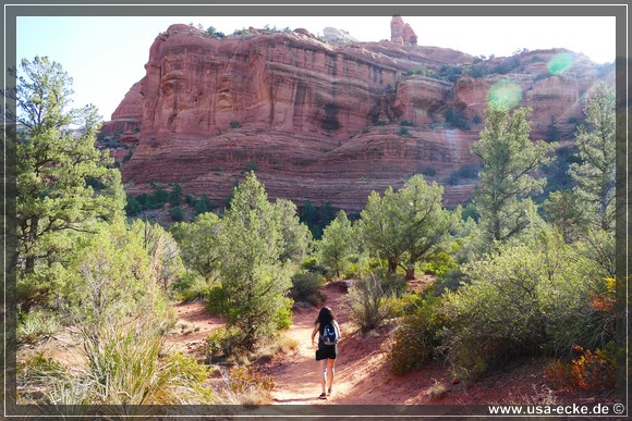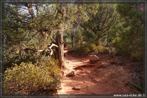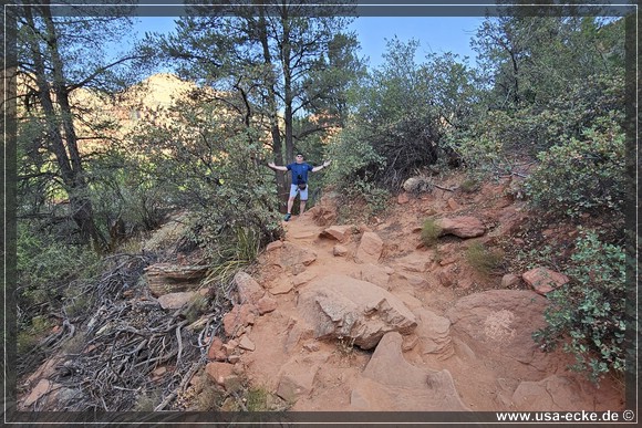 Nachdem wir das Enchantment Resort hinter uns gelassen haben, folgen wir dem gut erkennbaren Pfad weiter in Richtung Boynton Canyon. Nach etwa einer Stunde biegen wir rechts ab und verlassen damit auch den Boynton Canyon Trailhead. Man muss ein wenig aufpassen, dass man die Abzweigung nicht verpasst, aber meistens liegen Stein- oder Holzpfeile auf dem Boden und weisen den Weg zu unserem geplanten Ziel. |
