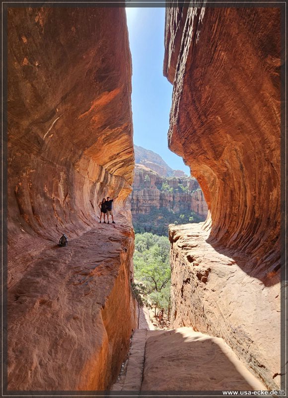 Michael erkundet den zweiten Weg, den man hierher gehen koennte, kommt aber schnell zurueck. Er fuehrt vorne rechts, wo er auf dem oberen Bild steht, in einem 180° Bogen ums Eck herum und ist sehr abschuessig. Prinzipiell geht das schon, aber wenn man auf dem stellenweise sandigen Fels nur leicht abrutscht, wars das. Es ist dort so tief, das ueberlebt man wohl nicht. Neeee, so schwierig kann der Abstieg gar nicht sein, als dass wir dieses Risiko eingehen wuerden.