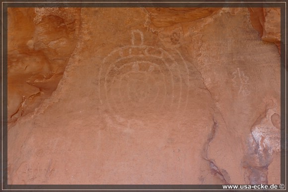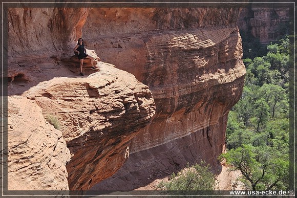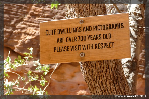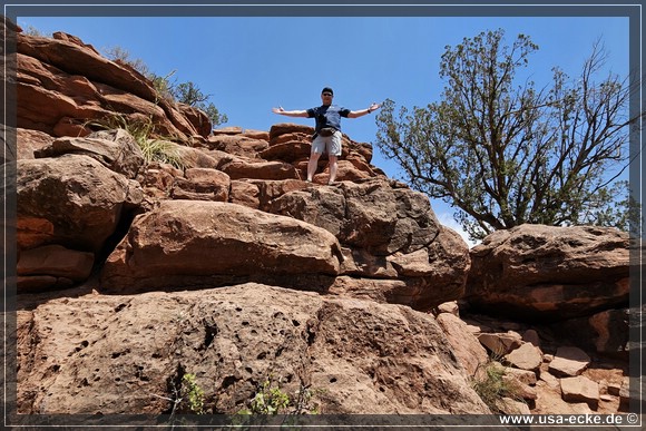 Hier ober sind ganz nette kleine Caves, die frueher mal Behausungen fuer die Ureinwohner waren. In den sogenannten Cliff Dwellings sind sogar einige Pictographs, also Felsmalereien zu finden. All das ist mehr als 700 Jahre alt. Wirklich klasse, hier etwas rumzuklettern, auch wenn es mit zunehmenden Temperaturen immer anstrengender wird. |