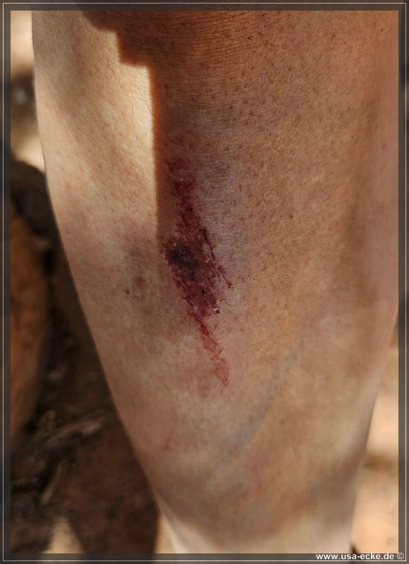 Wir brechen auf zurueck in Richtung Parkplatz. Als wir auf halber Strecke zurueck eine kurze Pause einlegen, ist meine Wunde am Schienbein gut getrocknet. Sieht gar nicht mal so schlimm aus, halb so wild. So laufen wir weiter und erreichen schliesslich um 11.15 Uhr den Parkplatz. Dreieinhalb Stunden sind wir unterwegs gewesen, das war es wirklich wert. Ein richtig toller Hike, den man hier machen kann. |