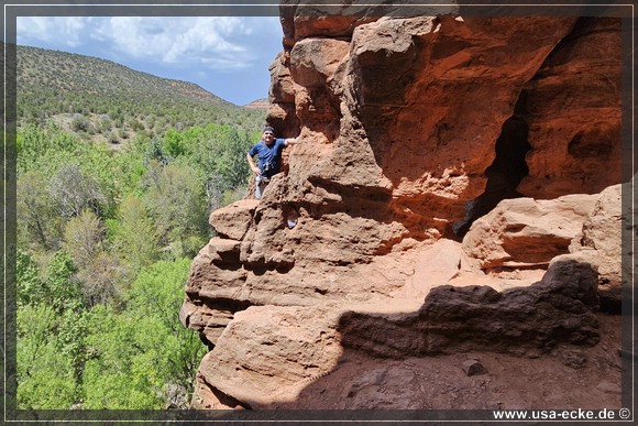 Um zu den Hoehlen oberhalb des Oak Creek zu gelangen, muss man ein Stueck hinunterklettern, was sich aber als relativ einfach herausstellt. Wir erkunden die netten kleinen Caves und klettern ein wenig herum. |