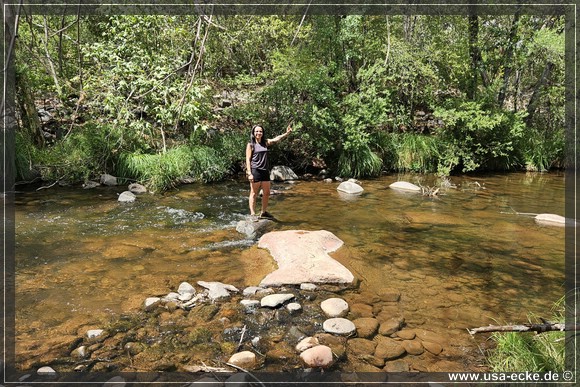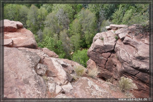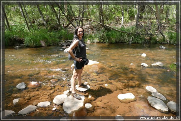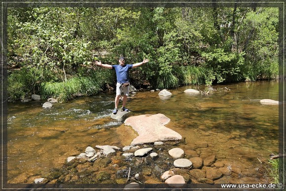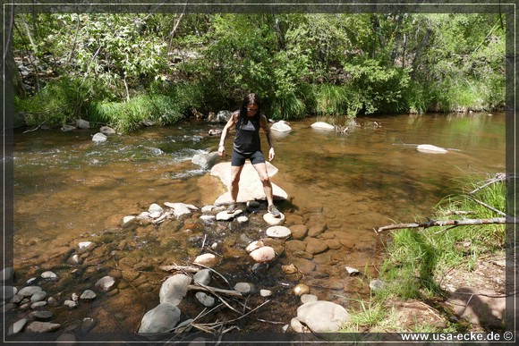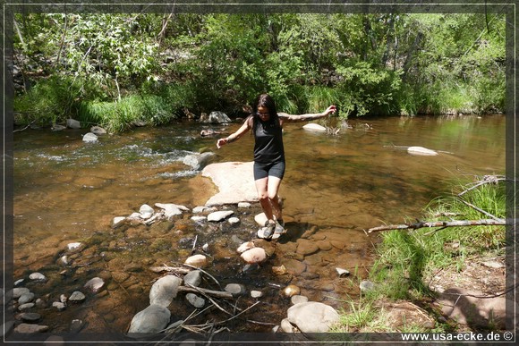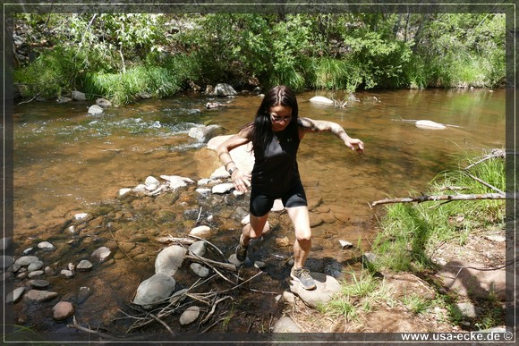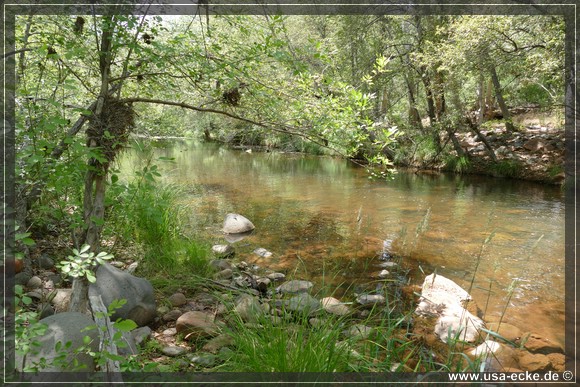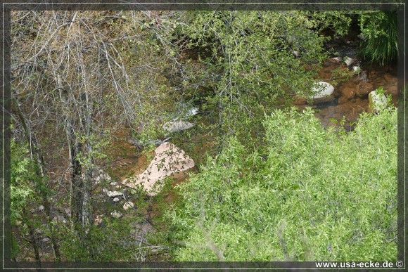 Nun ueberlegen wir, ob es sich lohnt, hinunter zum Fluss zu steigen. So schlimm kanns ja nicht sein, also machen wir uns auf den Weg und sind nur wenige Minuten spaeter am Ufer des Oak Creek. Jetzt lassen wir uns etwas Zeit, halten die Fuesse ins Wasser, und geniessen die Ruhe und das Plaetschern des Flusses. |